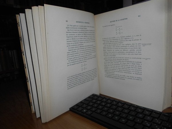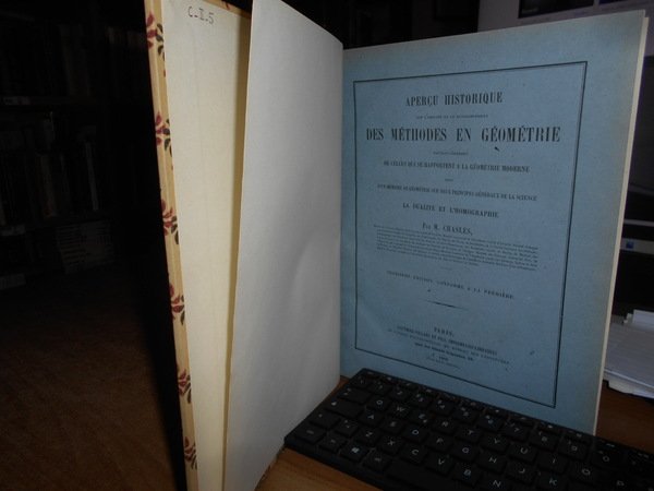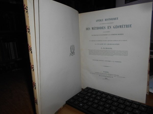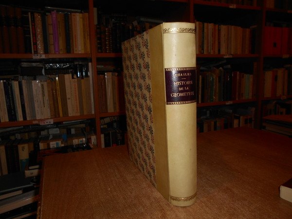 par M. Chasles. Paris, Gauthier-Villars et Fils, 1889. Aperçu historique. HISTOIRE DE LA GEOMETRIE particulièrement de celles qui se rapportent a la Géométrie moderne suivi d' un mémorie de géométrie sur deux principes généraux de la science. La dualite et l' homographie. Terza edizione. In-4°, m. pergamena con titolo in oro entro tassello al dorso, copertine originali conservate. (4), 851 pp. Esemplare perfetto. Uff. C - II - 5
