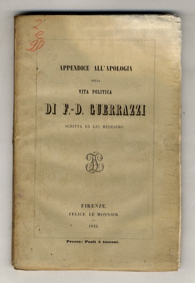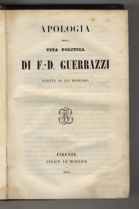 Firenze, Felice Le Monnier, 1851 - 1852, voll. 2, in-8, la prima opera e ben rilegata in mezza pelle con titolo e filetti in oro al dorso, la seconda in brossura editoriale, pp. VIII, 829, [1] - VII, [1], 182. Con ritratto di Guerrazzi inciso in acciaio da L. Errani all'antiporta del primo titolo. Prime edizioni. Tracce di umidità alle prime ed ultime carte dell'Appendice. Leggera mancanza alla carta marmorizzata di un piatto dell'Apologia.