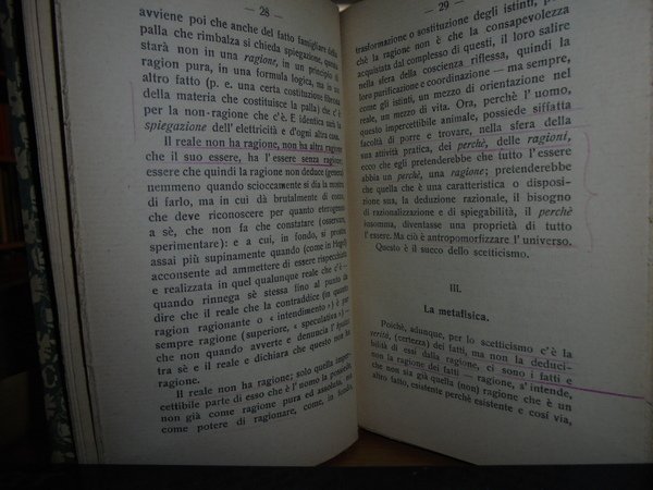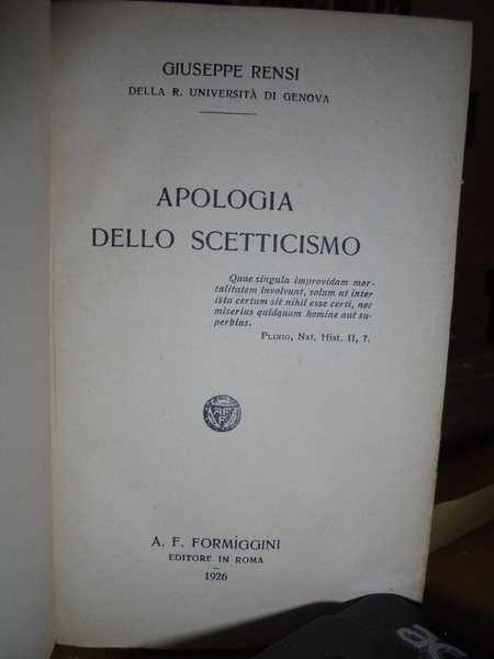 Rensi, Giuseppe. In Roma, A.F. Formiggini, 1926. Apologia dello Scetticismo. In-16° piccolo, tela edit. con titoli. 132 pp. In ottimo stato di conservazione con sottili sottolineature a matita rossa in poche pagine. Neg. mob. bianco piccolo