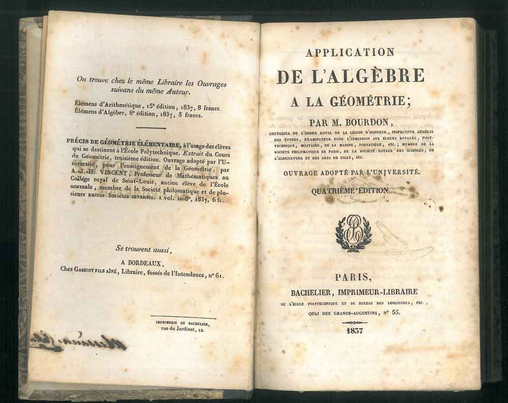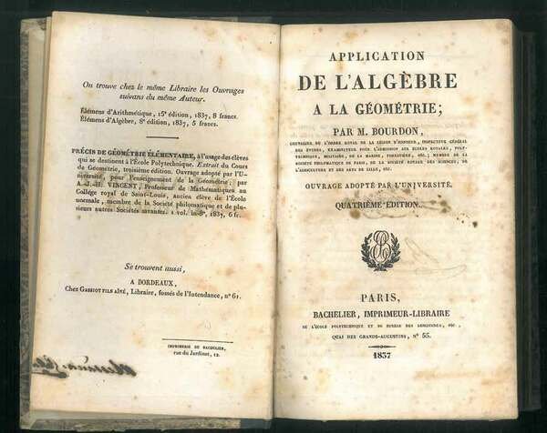 <p>21 cm, rilegatura coeva in mezza pelle, piatti marmorizzati, titolo e fregi impressi in oro al dorso, p. XVI, 606 (8). Con 15 tavole algebriche più volte ripiegate f.t. In appendiceun estratto del catalogo dell'editore a numerazione propria. Alcune bruniture che non disturbano la lettura del testo. Firma di possesso all'antiporta. Testo in francese.</p>