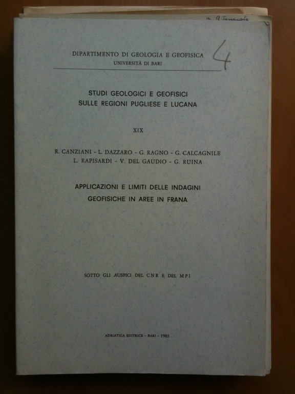 APPLICAZIONI E LIMITI DELLE INDAGINI GEOFISICHE IN AREE DI FRANAR. Canziani - L. Dazzaro - G. Ragno - G. Calcagnile - L. Rapisardi - V. Del Gaudio - G. RuinaDipartimento di Geologia e Geofisica Università di BariStudi Geologici e Geofisici sulle regioni Pugliese e Lucana XIXSotto gli auspici del CNR e del MPI 198324 pagine Formato 17x24 (72 g)E3249