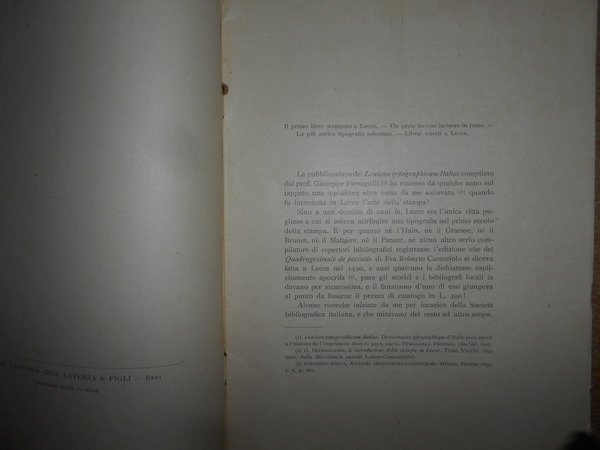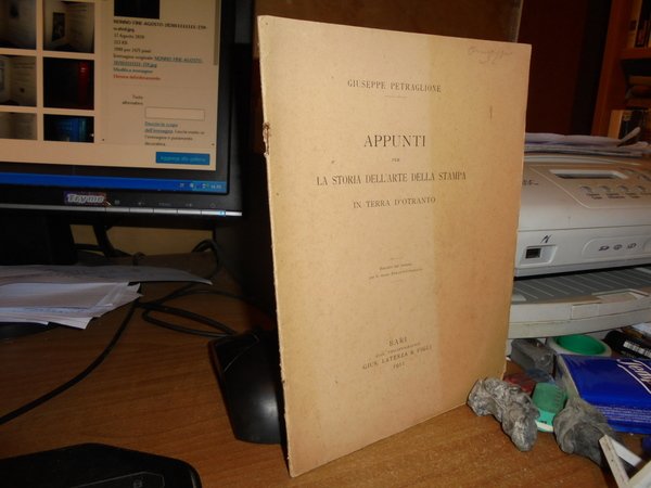 Giuseppe, Petraglione. Bari, Gius. Laterza & Figli, 1911. Appunti per La Storia dell' Arte della Stampa in Terra d' Otranto. In-8°, br. orig. 12 pp. con una tavola fuori testo. Raro opuscolo ben conservato. Uff. A - II - 3 - 2