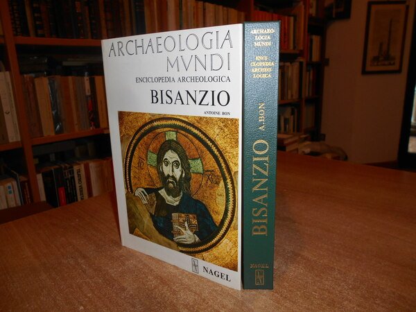 ANTOINE BON. Roma, Edizioni Nagel, 1975. Archaeologia Mundi. BISANZIO. Traduzione di Simonetta Meucci. In-8°, similpelle verde con titolo ion oro al dorso e sovracopertina ill. a col. 213 pp. con 90 tavole a colori; 51 illustrazioni in bianco e nero. Come nuovo. Uff. stanzetta mob. a sinistra.