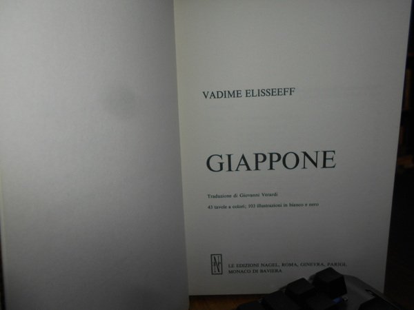 VADIME ELISSEFF. Roma, Nagel Edizioni, 1976. Archaeologia Mundi. GIAPPONE. Traduzione di Giovanni Verardi. In-8°, similpelle edit. con titolo in oro al dorso e sovracopertina ill. a col. 223 pp. con 43 tavole a colori; 103 illustrazioni in bianco e nero. Come nuovo. Uff. stanzetta mob. a sinistra.