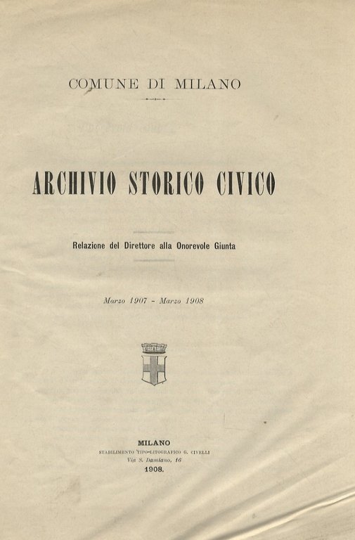 Milano, Stabilimento Tipo-litografico G. Civelli, 1908, in-4, br. editoriale, pp. 37, [3]. Il direttore dell'Archivio è Ettore Verga. Angoli esterni bassi arricciolati.