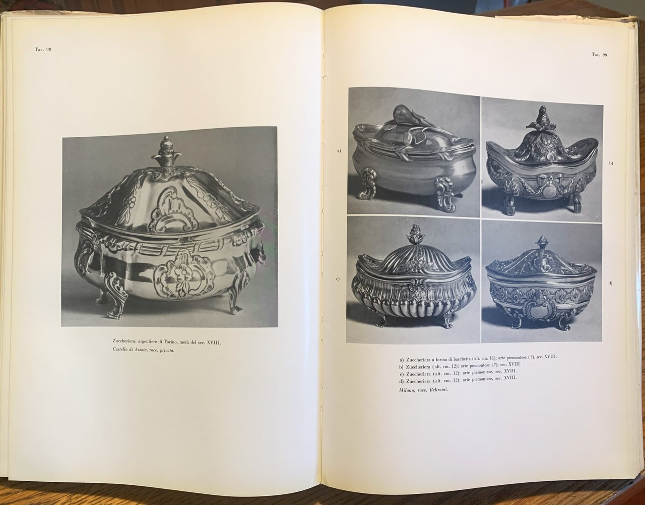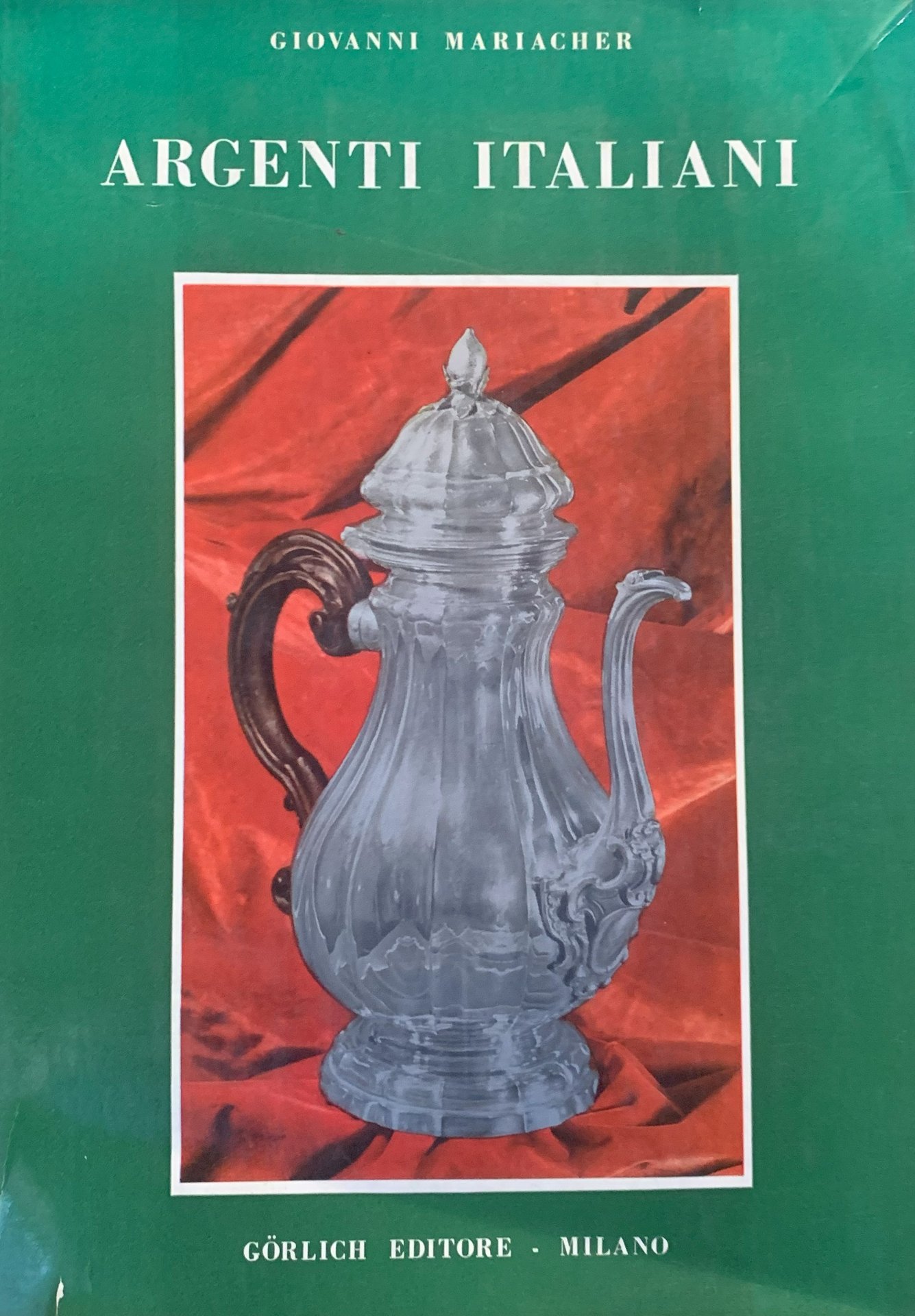I ed. "Quest'opera sugli argenti italiani ha avuto, per la verità, una assai lunga gestazione. / Essa fu iniziata nel 1958 dal compianto professor Giuseppe Morazzoni, in collaborazione con il sig. Saul Levy. Poi, nel mese di luglio del '59, il prof. Morazzoni passò a miglior vita e il Levy riordinò il materiale già raccolto per la stesura iconografica; materiale di indubbio interesse ma non certo sufficientemente vasto per poter passare alla pubblicazione dell'opera. / Dovetti quindi pregare l'emerito professor Giovanni Mariacher, di Venezia, di portare a termine l'opera" (dalla Presentazione dell'Editore, p. 7). Indice generale: Presentazione; L'Editore - Introduzione (Il Medio Evo - Il Rinascimento - Il Barocco) - Bibliografia essenziale - 242 Tavole in b/n. In-4, pp. 32+242 tavole con illustrazioni in b/n+(2). Copertina con illustrazione a colori al primo piatto (Caffettiera, alt. 33 cm, arte romana, sec. XVIII. Milano, raccolta del conte G.F. Longoni. Oltre alle tavole suddette una tavola in b/n in antiporta. Il volume termina con la produzione moderna (Milano, produzione Amilcare Negrini - Padova, produzione Mario Pinton - Milano, produzione Luigi Genazzi di Eros - Milano, produzione De Vecchi - Milano, produzione Piero De Vecchi, disegnatore Gabriele De Vecchi - Milano, produzione Luigi Genazzi, disegnatore Eros Genazzi etc.). Stato buono (stato d'uso della sovraccoperta che presenta piccoli e più consisstenti strappi ai margini - pagine leggermente ingiallite)