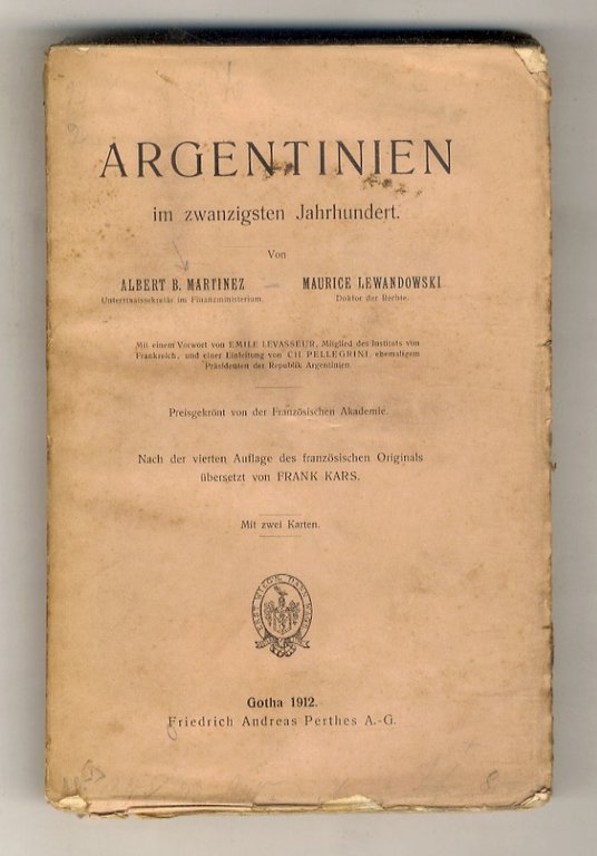 Gotha, Friedrich Andreas Perthes, 1912, in-8, br. editoriale, pp. XLVIII, 354. Con 2 carte geografiche ripiegate f.t. Prima edizione tedesca di questo studio sull'Argentina del primo Novecento. Lievi mancanze al dorso. Qualche fioritura.