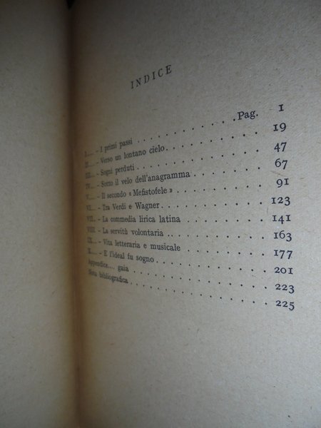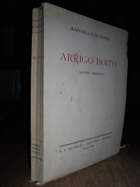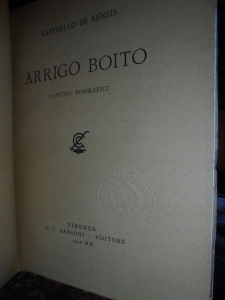 Raffaello De Rensis. Firenze, G.C. Sansoni Editore, 1942. ARRIGO BOITO capitoli biografici. In-8° piccolo, cartoncino edit. orig. 224,(2) pp. con 5 tavole fuori testo stampate su carta patinata. Nel libro R. De Rensis (1879-1970), musicologo e critico musicale, mette in luce alcuni periodi e aspetti della vita di Arrigo Boito. Autore di numerosi contributi su diversi musicisti, si interessò particolarmente alla complessa personalità di Arrigo Boito, di cui per primo pubblicò una larga scelta dell'epistolario (1932). Prima edizione. Ben conservato. Neg. pacco 4 Valla. carc.