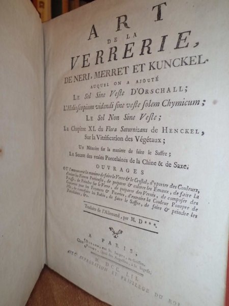 Art de la Verrerie, De Neri, Merret et Kunckel, Auquel on ajouté Le Sol Sine Veste d' Orschall; L' Helio scopium videndi sine veste solem Chymicum; Le Sol Non Sine Veste; Le Chapitre XI. du Flora Saturnizaz de Henckel, Sur la Vitrification des Végétaux; Un Mémoire sur la maniere de faire le Saffre; Ouvrages ou l' on trouvera la maniere de faire le Verre & le Crystal d' y porter des Couleurs, d' imiter les Pierres Prétieuses, de preparer & colorer les Emaux, de faire la Potasse, de Peindre sur la Verre, de preparer des Vernis, de composer des Couvertes pour les Fayances & Poteries, d' extraire la Couleur Pourpre de l' Or, de contrefaire les Rubins, de faire le Saffre, de faire & peindre les Porcellaines, ecc. Traduits de l' Allemand M. D***. Paris, Durand et Pissot, 1752. Prima edizione collettiva di questi trattati trad. da P. F. Dietrich barone d' Holbach. In - 4°, piena pelle coeva, dorso a 5 nervi con fregi floreali in oro. (4), LV, 629 n. e 3 nn., e 16 belle tavole incise in rame ripiegate fuori testo raffiguranti le varie tecniche descritte. Bellissimo esemplare del trattato più completo sull' arte vetraria dell' epoca. Cfr.: Duveen, 427; Partington, Hist. of Chemistry, I - 364 e seg.: The best account of glass - making in existence. It is divided into two parts, the first containing the seven books of Neri and the notes of Merret.the second part, by Kunchel is divided into three books (100 experiments on calcination, gilding and painting glass - 60 experiments on making and painting faience in the Dutch style - 50 experiments on casting various models of plants from silver, colouring gypsum marbling paper, making plastic wood, etc). Ferguson, II, p. 135. Duveen, p. 427.