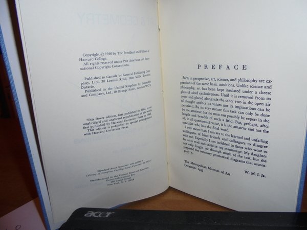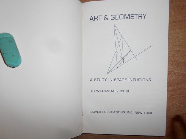 WILLIAM M. IVINS JR. New York, Dover Publications,1964. ART & GEOMETRY a Study in Space Institutions. In-8°piccolo, tela azzurra con titolo in oro entro tassello al dorso. x, 113, (2) pp. con alcune illustrazioni nel testo. Come nuovo. Uff. C - II - 6
