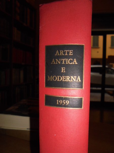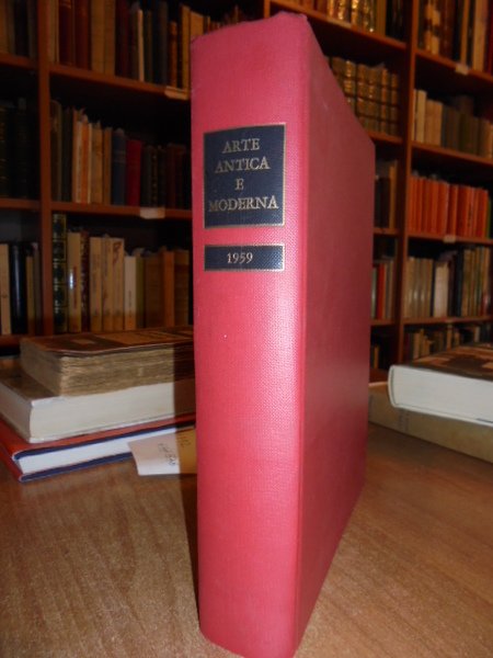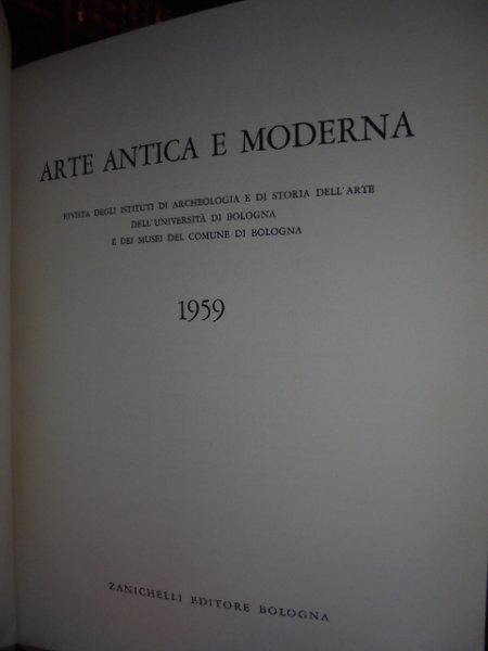 Autori vari. Bologna, Zanichelli, 1959. ARTE antica e moderna rivista degli Istituti di Archeologia e di storia dell' Arte dell' Università di Bologna e dei Musei del Comune di Bologna. In-8° grande, tela edit. 474, (4) pp. con 1 tavola a colori f.t. e innumerevoli illustrazioni in bianco e nero n.t. Lievi segni del tempo alle copertine ma volume molto ben conservato. Neg. mob. 19