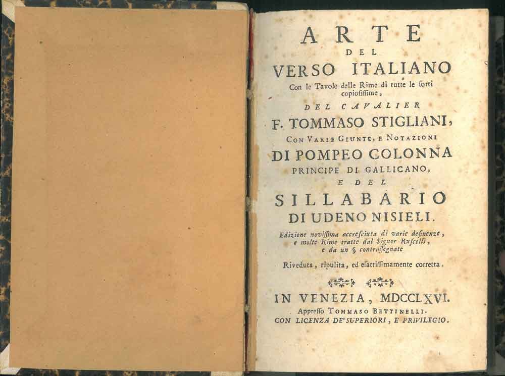 Arte del verso italiano con le tavole delle rime di tutte le sorti copiosissime, del cavalier F. Tommaso Stigliani, con varie giunte, e notazioni di Pompeo Colonna . e del Sillabario di Udenio Nisieli. Edizione novissima accresciuta di varie desinenze