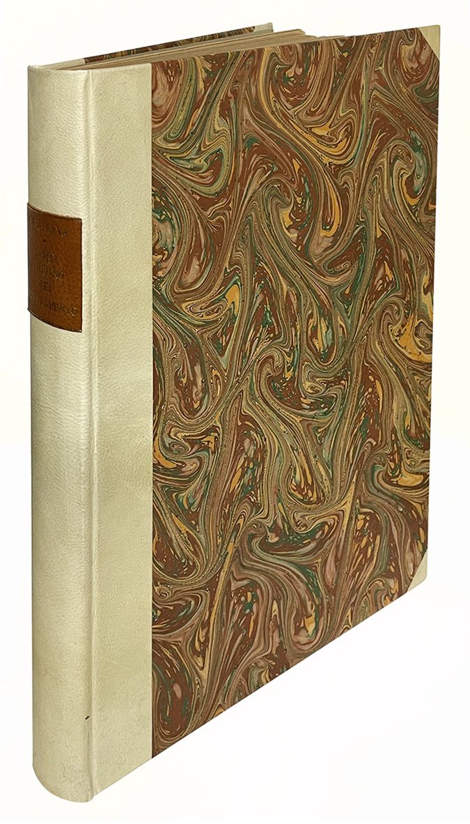 In 4to (mm 350x253); pp. 96, [2], LIII c. di tavola. Carta uniformemente brunita, lievissime fioriture marginali ad alcune carte. Mezza pergamena moderna con punte, piatti rivestiti con carta colorata, titolo su tassello al dorso. Sono conservate le copertine originali. Edizione di 500 copie numerate, quella offerta è la n. 168.