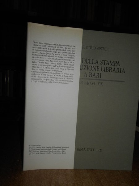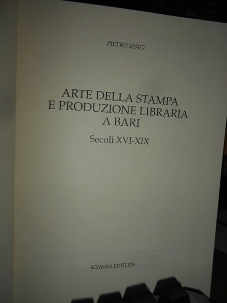 PIETRO SISTO. Fasano di Brindisi, Schena Editore, 1994. Arte della Stampa e Produzione Libraria a Bari. In-8°, tela edit. con sovracopertina. 392, (2) pp. con 67 figure n.t. e XII tavole a colori. Come nuovo. Uff. B - III - 2