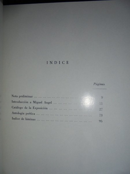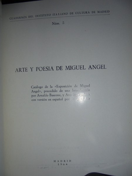 Arte y poesia de Miguel Angel. Catalogo de la “Exposicion de Miguel Angel” , precedido de un Introduccion por Arnaldo Bascone, y antologia poetica con version en espanol por Joaquin Arce. In-8° piccolo, cart. edit. con alette. 95 pp. con numerose tavole in bianco e nero n.t. Come nuovo. Neg. lett. mod. mob. H