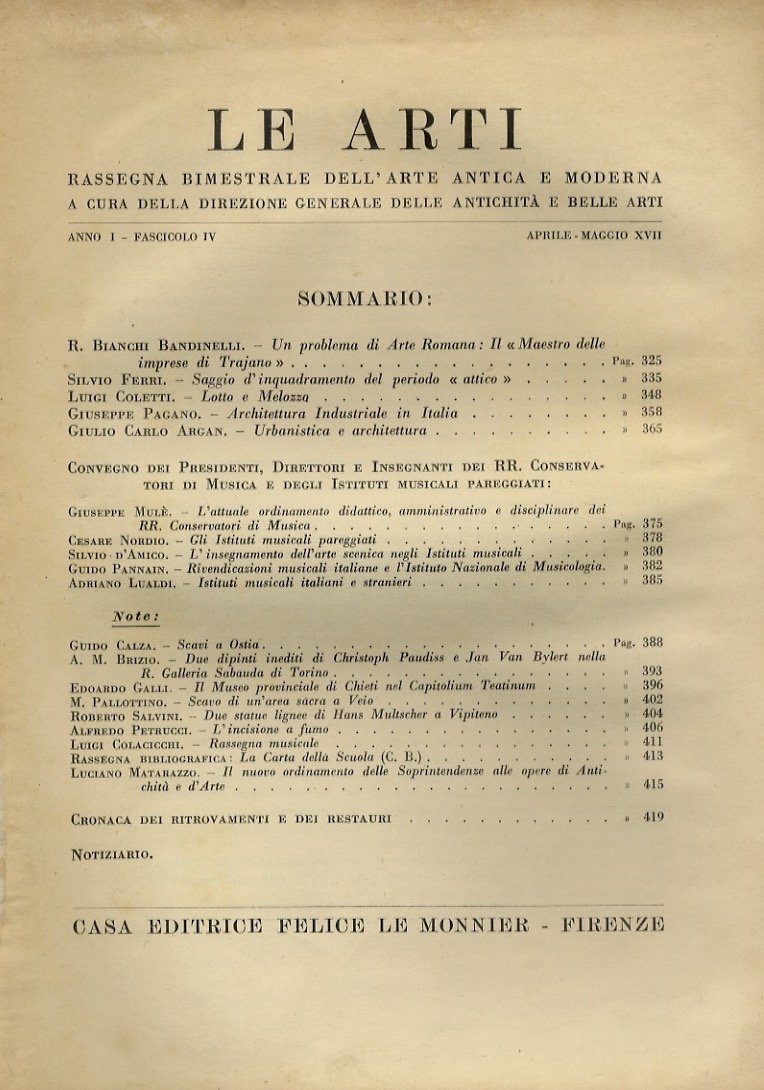 ARTI (Le). Rassegna bimestrale dell'arte antica e moderna. A cura della Direzione Generale delle Antichità e Belle Arti. Direttore M. Lazzari. Anno I, fascicolo IV. aprile-maggio 1938-XVII.