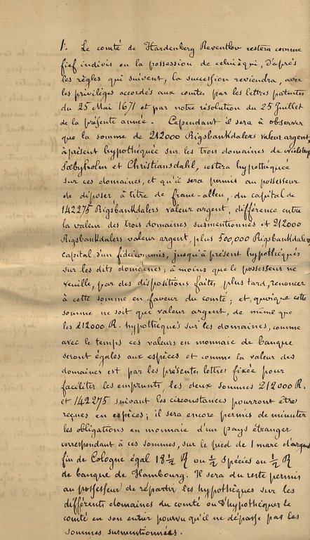 Articles de la lettre patente d'érection du Comté de Hardenberg Reventlov.