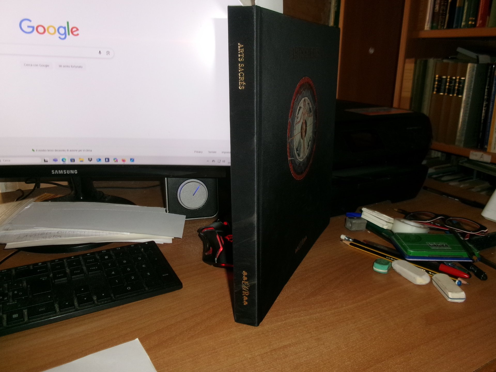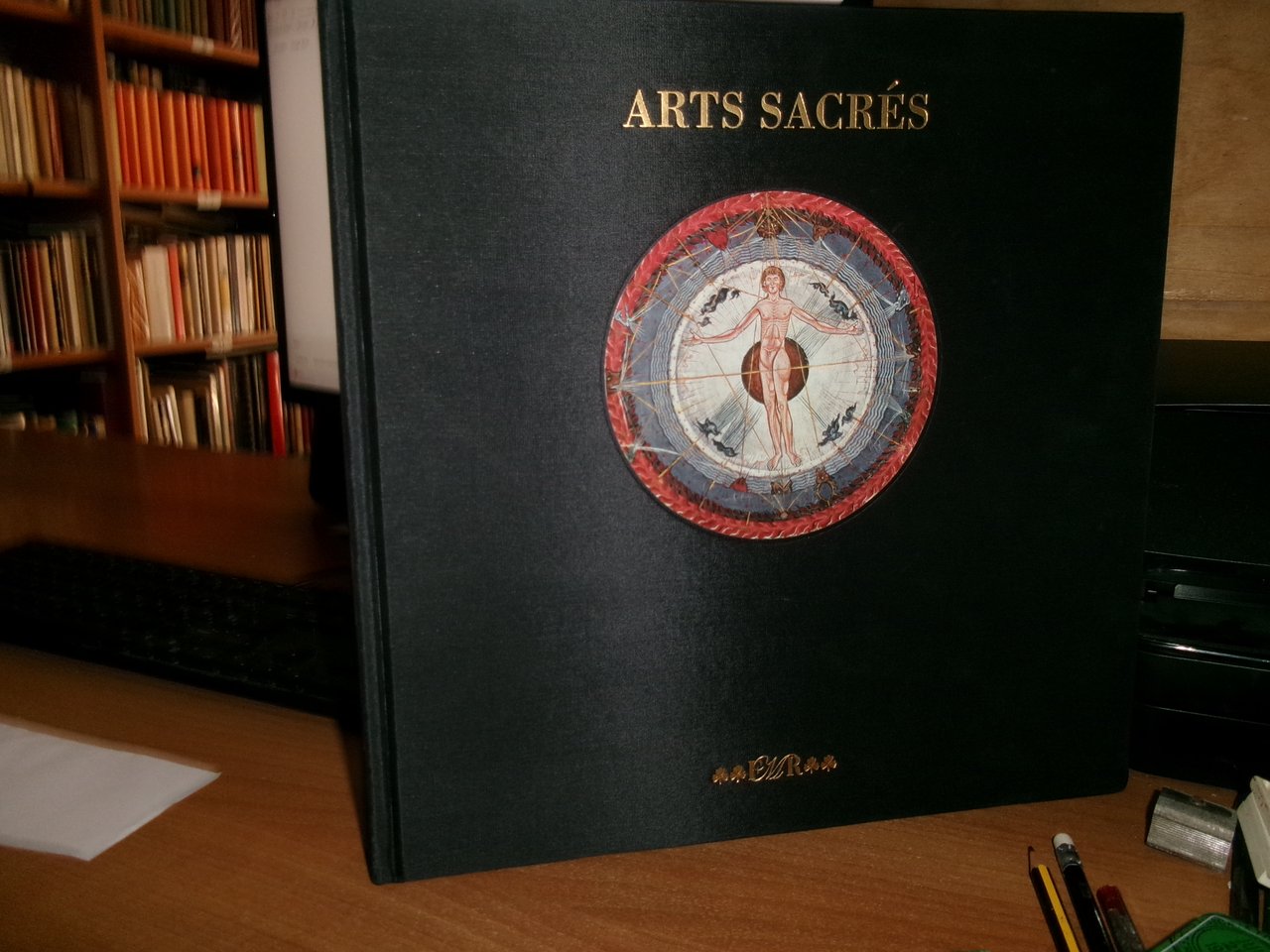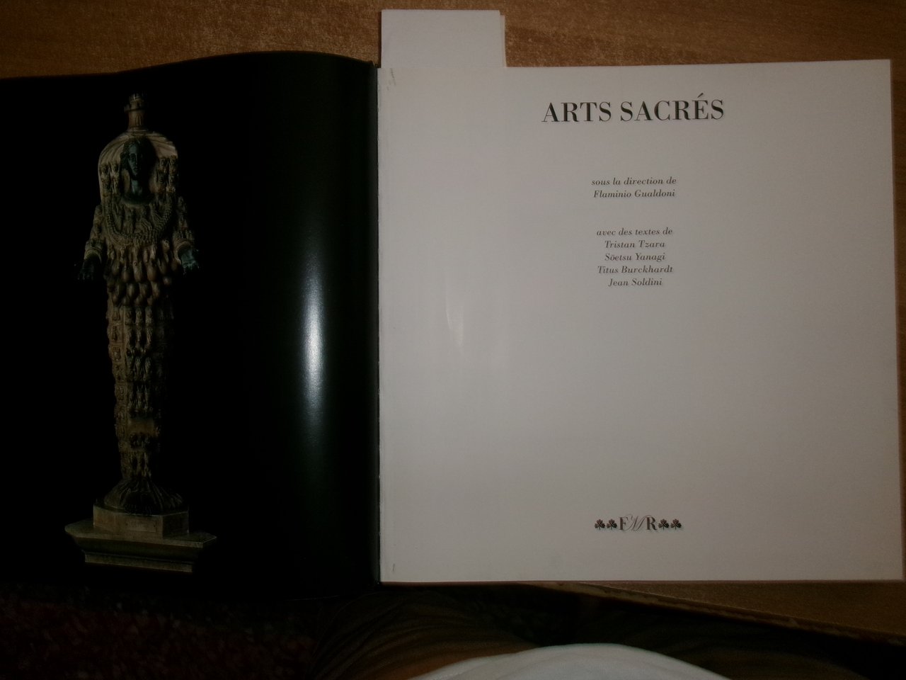 ARTS Sacrés sous la direction de FLAMINIO GUALDONI avec des textes de Tristan Tzara - Soetsu Yanagi - Titus Burckhardt - Jean Soldini. Bologne, (Villanova di Castenaso), 2008. In-4° grande quadrato, tela nera edit. con figura a colori applicata sul piano anteriore. 270 pp. con numerose illustrazioni a colori anche a piena pagina. Ottimo stato con testo in francese e un lievissimo difetto a pag. 146/147 come da foto. Neg. mob. nero in basso.
