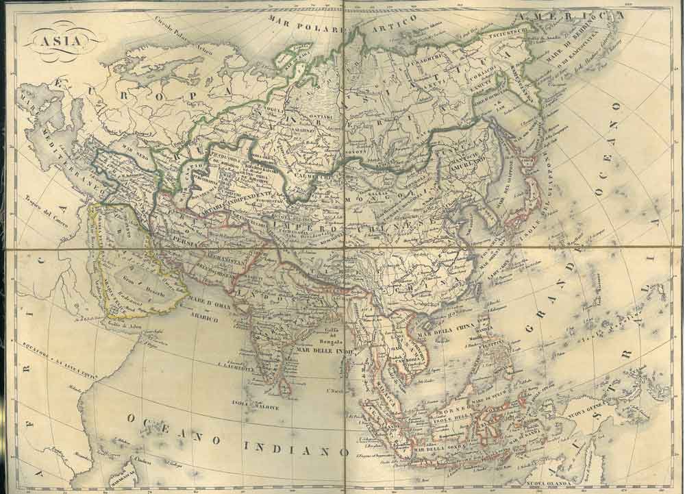 39x29 cm (aperta), carta geografica ripiegata riportata su tela; i confini sono segnati a colori a mano;