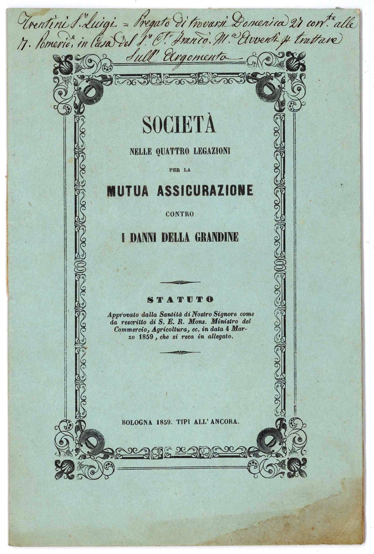 -SOCIETÀ nelle quattro legazioni per la Mutua Assicurazione contro i danni della grandine. Statuto… Bologna, Tipi all'Ancora, 1859.