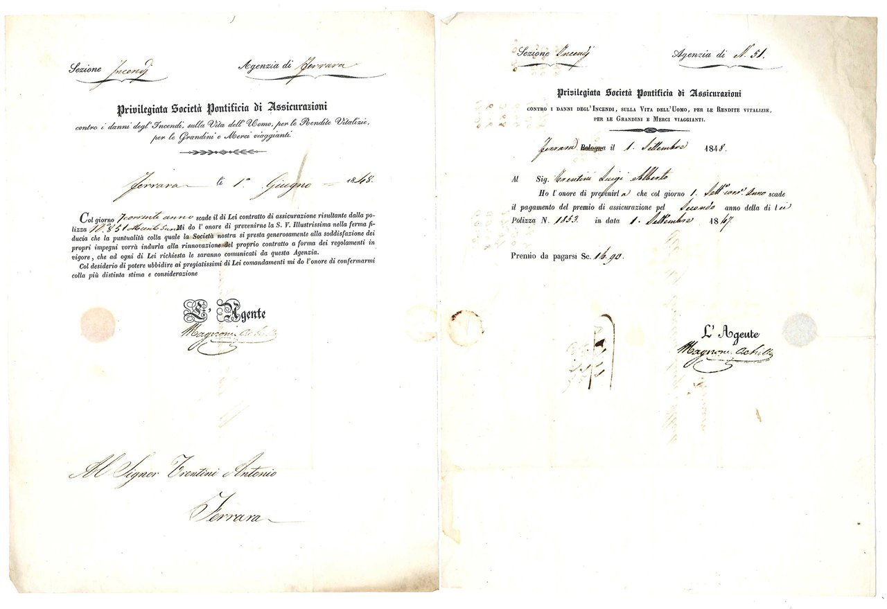 -AVVISI DI SCADENZA POLIZZE ASSICURATIVE. Tre avvisi di scadenza indirizzati dalla ‘Società Pontificia di Assicurazioni contro i Danni degl'Incendi, sulla Vita dell'Uomo, per le Rendite Vitalizie, per le Grandini e Merci Viaggianti' al sig. Antonio Trentini di Ferrara in data 1 giugno e 1 settembre 1848.