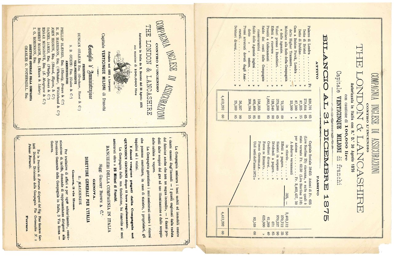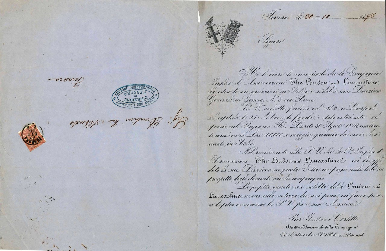 Due fogli volanti (mm 207x265) stampati solo al resto contenenti l'organigramma della compagnia e il bilancio al 31 dicembre 1875. I due fogli sono conservati in una brossura azzurra recanti delle armi nobiliari e un testo, datato Ferrara 30 ottobre 1876, in cui si annuncia l'apertura in Italia delle attività assicurative della compagnia inglese, fondata a Liverpool nel 1862, la quale, grazie all'autorizzazione del Re, ha stabilito la sua direzione generale a Genova. La nota è firmata dal direttore divisionale di Ferrara, Pier Gustavo Carletti, ed è indirizzata al sig. Alberto Trentini. Al verso il timbro della direzione di Ferrara della compagnia e un francobollo affrancato.