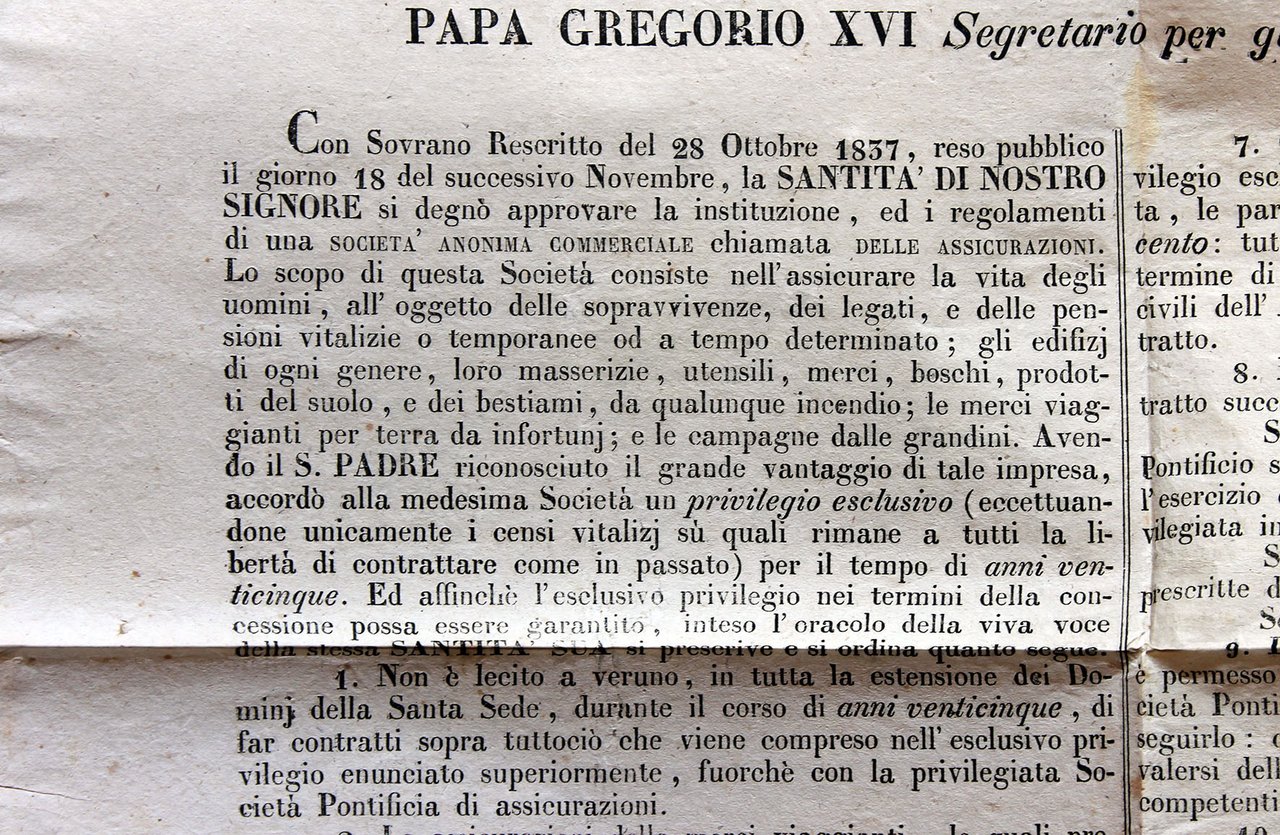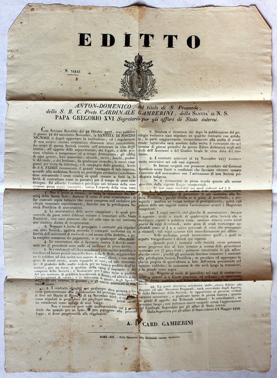 Interessante editto con cui il papa, il giorno 28 ottobre 1837, approvò l'istituzione di una “Società anonima commerciale chiamata delle Assicurazioni”, che aveva come scopo quello di “assicurare la vita degli uomini, all'oggetto delle sopravvivenze, dei legati, e delle pensioni vitalizie e temporanee od a tempo determinate; gli edifizj di ogni genere, loro masserizie, utensili, merci, boschi… da qualunque incendio; le merci viaggianti per terra da infortunj; e le campagne dalle grandini”. L'editto contiene anche i regolamenti della compagnia assicurativa divisa in 12 punti.