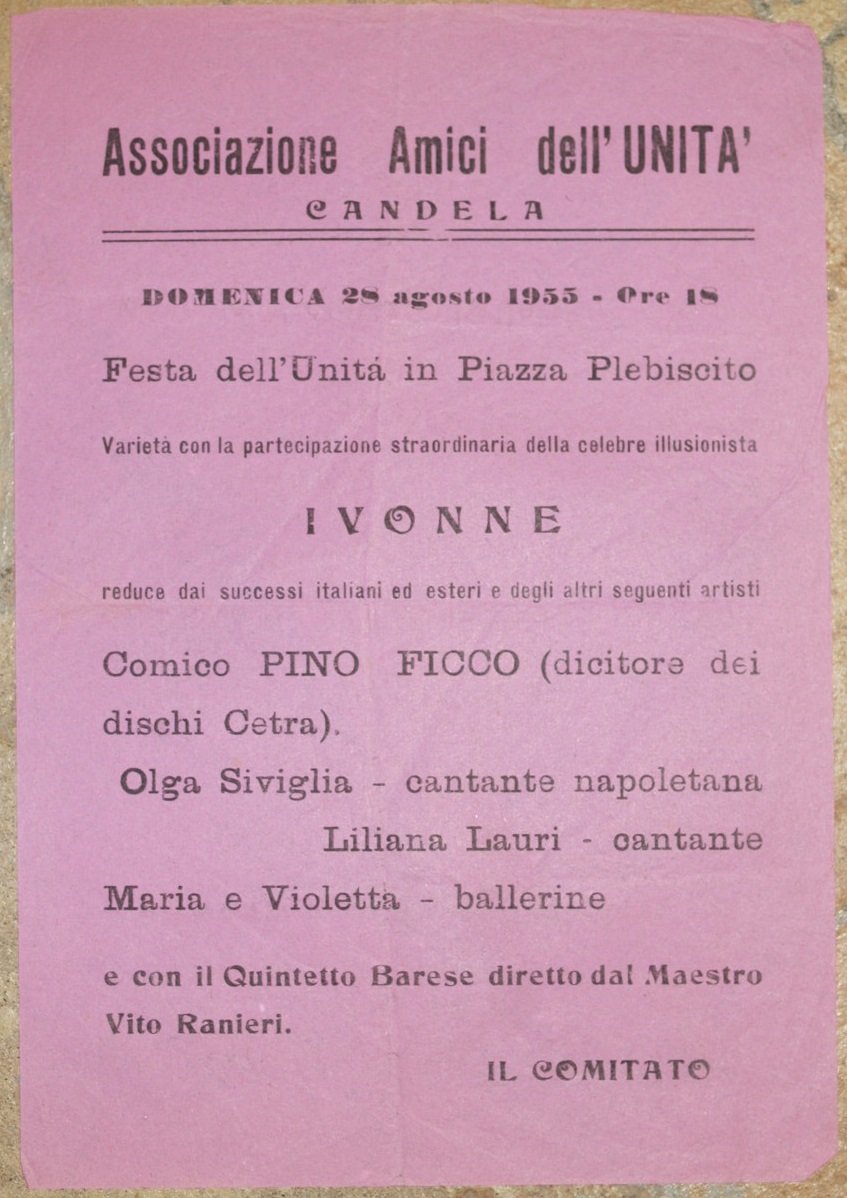 ASSOCIAZIONE AMICI DELL'UNITA CANDELA DOMENICA 28 AGOSTO 1955 - ORE 18 FESTA DELL'UNITA IN PIAZZA PLEBISCITO