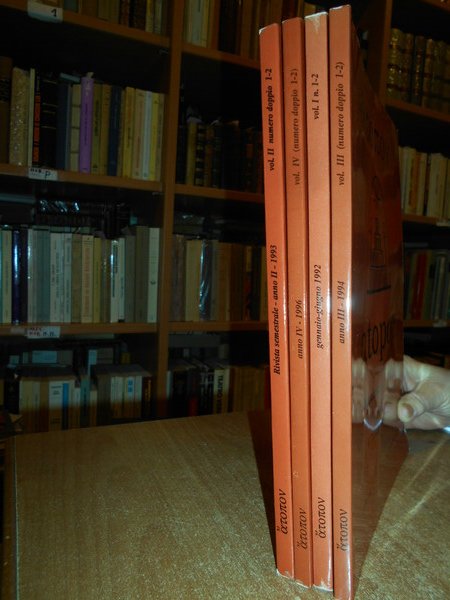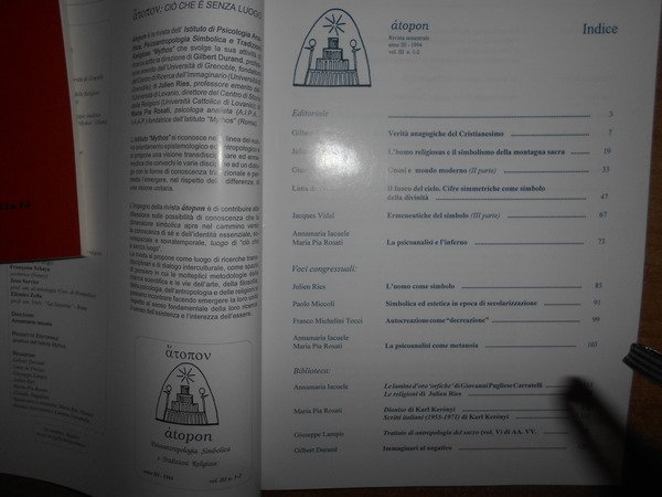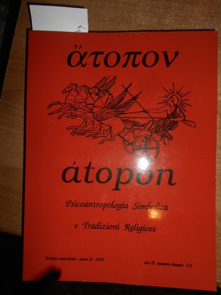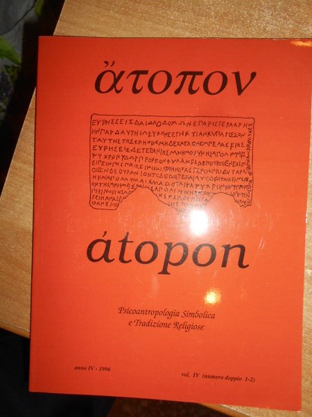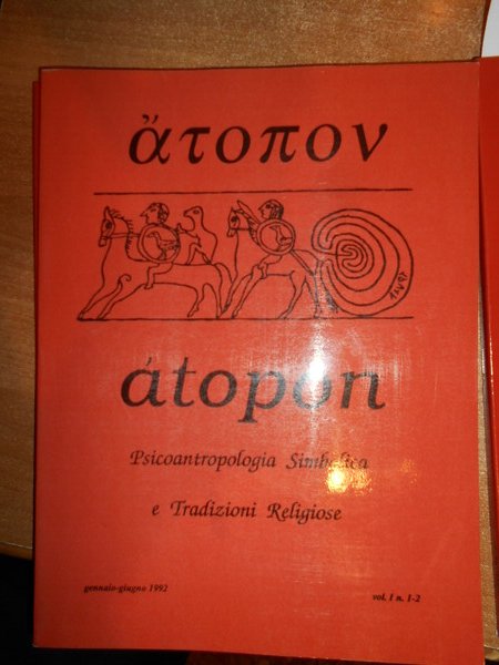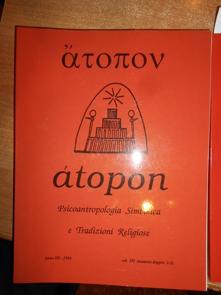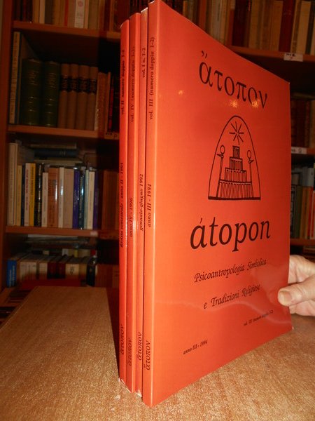 AA.VV. Roma, Istituto Mythos, 1992 - 1993 - 1994 - 1996. ATOPON. Psicoantropologia Simbolica e Tradizioni Religiose. 4 riviste in-4°, cartoncino edit. 144 pp.; 136 pp.; 124 pp.; 144 pp. corredate da numerose illustrazioni in bianco e nero nel testo. Come nuove. Uff. stanzetta.