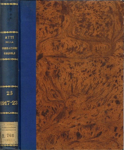 Volume Ventiseiesimo della collana Atti della Fondazione Scientifica Cagnola. Volume degli anni 20' del '900 in buono stato, coperta in mezzatela con angoli, piatti marmorizzati, sul dorso bei fregi e caratteri incisi in oro e talloncino in carta con catalogazione bibliotecaria, bordo poco sfregato, ammaccatura, macchiette, tagli bruniti, quello di testa di colore bordeaux, pagine ben conservate, prime, ultime e margini un po' ambrati. Il rilegatore ha mantenuto all'interno del volume i piatti originali, in carta, lievi bruniture, bella cornice incisa in nero su piatti, quello inferiore anche con fregio figurato, piatto anteriore con catalogazione bibliotecaria. Presenta un talloncino in carta con catalogazione bibliotecaria su risguardia, timbro ex biblioteca su occhiello ed excipit, X tavole, fuori testo, protette da foglio di carta velina. Numero Pagine 364