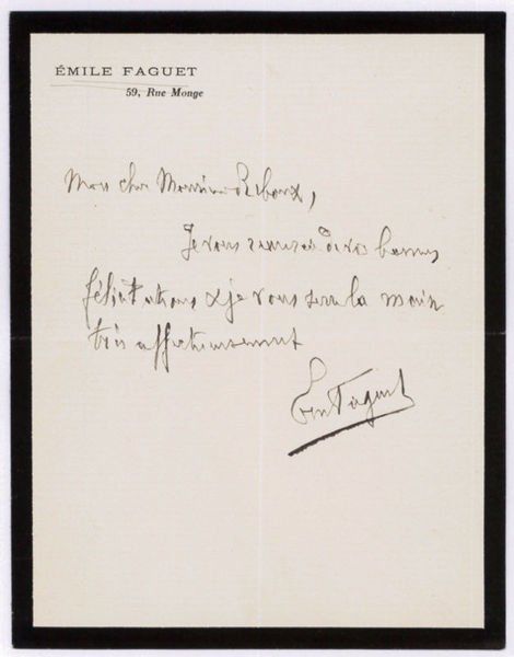 12mo. 1 p. on bifolium. To thank the author and humorist Paul Reboux for a letter of congratulations: "Je vous remercie de vos bonnes félicitations et je vpus serre la main bien affectueusement". - On mourning stationery with printed letterhead.