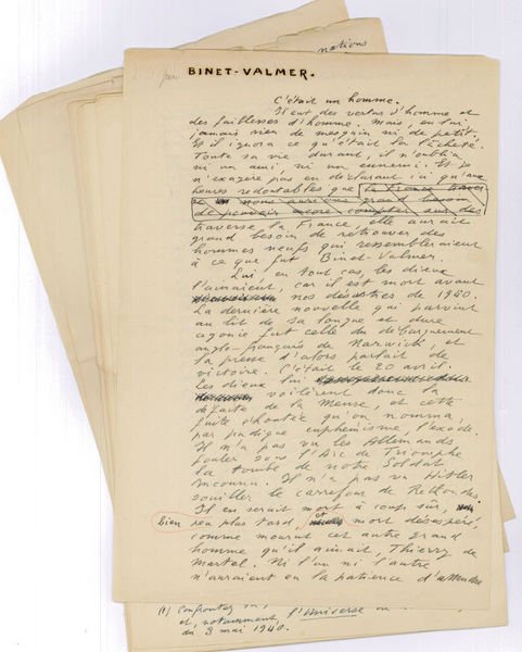 Folio. 16½ pp. on 17 ff. Obituary on the French writer Jean Binet-Valmer, who had died in April 1940: "C'etait un homme. Il eut des vertus d'homme et des faiblesses d'homme. Mais, en lui, jamais rien de mesquin ni de petit [.] Et je n'exagère pas en declarant ici qu'aux heures redoutables que traverse la France, elle aurait grand besoin de retrouver des hommes neufs qui ressembleraient à ce que fut Binet-Valmer [.]". - Edges slightly frayed, otherwise in good condition.
