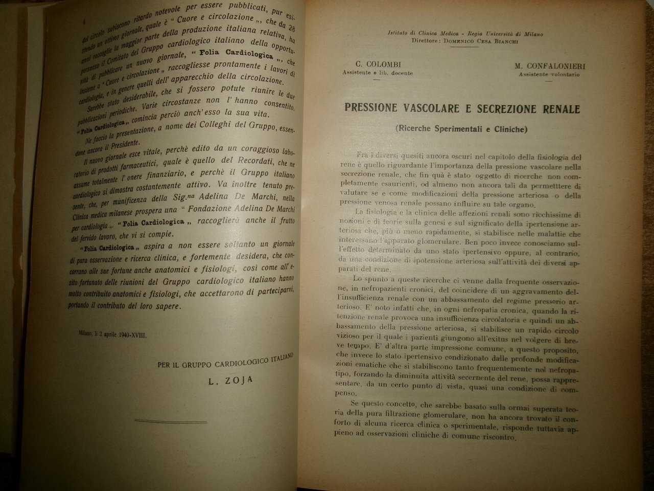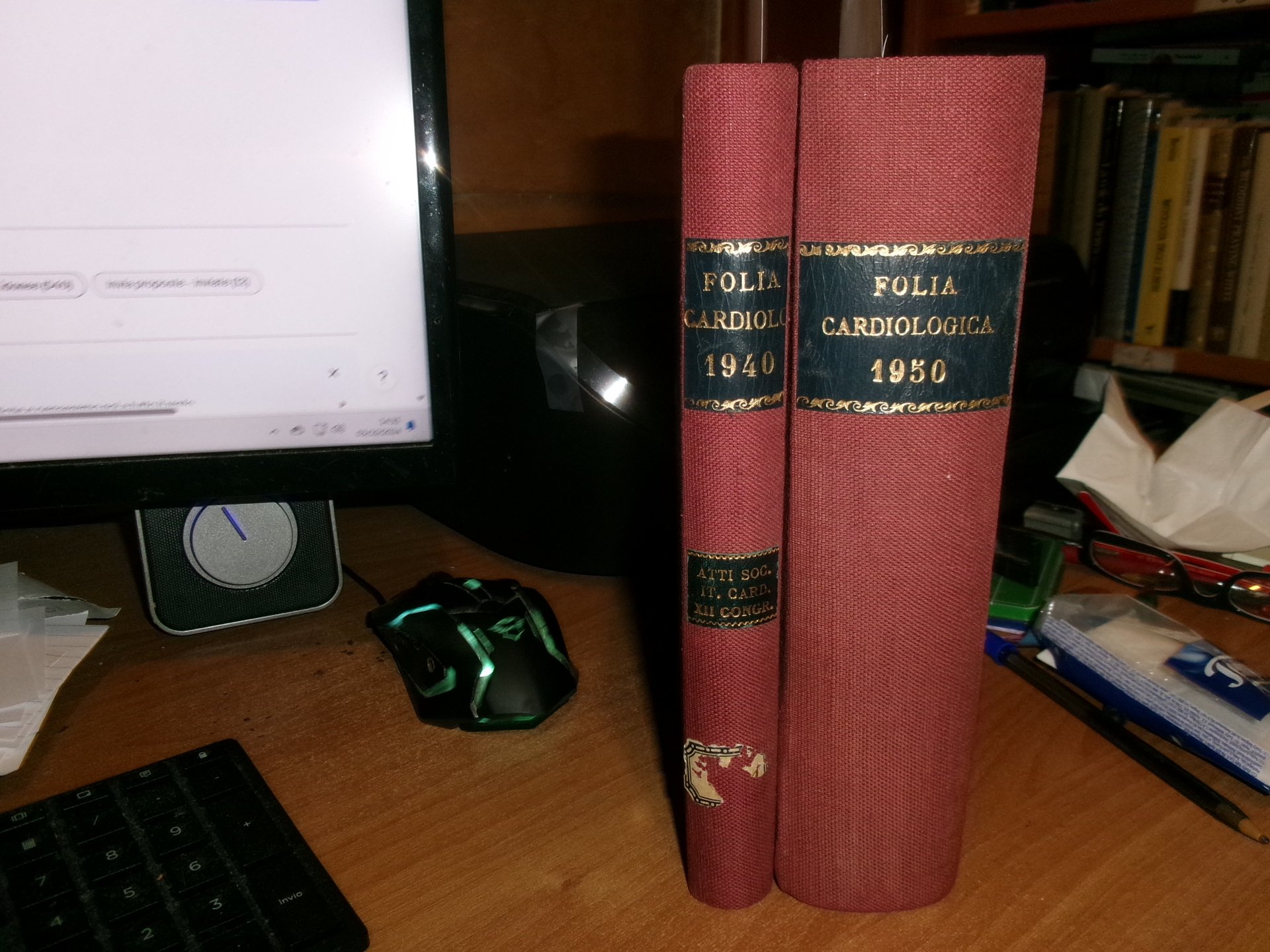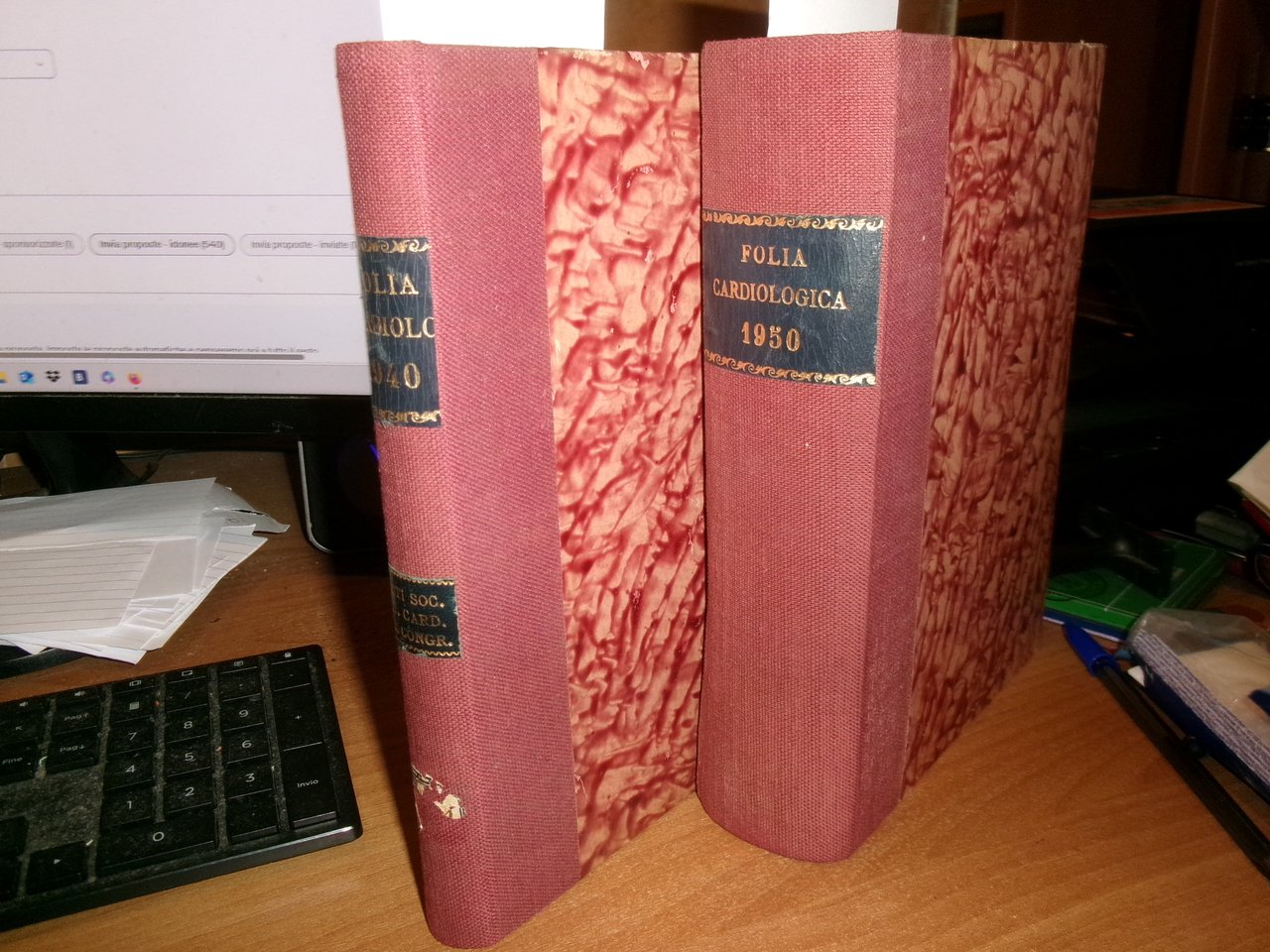 Autori Vari. FOLIA CARDIOLOGICA. Atti Soc. It. Card. Milano,1940/1950. 2 volumi in-8°, m-tela con titoli in oro entro tasselli ai dorsi. Vol. 1940. 103, 395 pp. con alcune figure in nero n.t.; Vol. 1950. 564 pp; 263 pp. con alcune illustrazioni n.t. Ottimo stato con lievi fioriture in fine (negli ultimi due fogli bianchi). Uff. salon. sporta 10