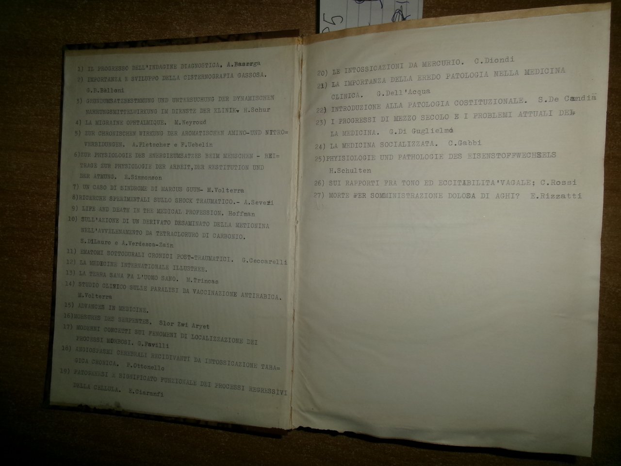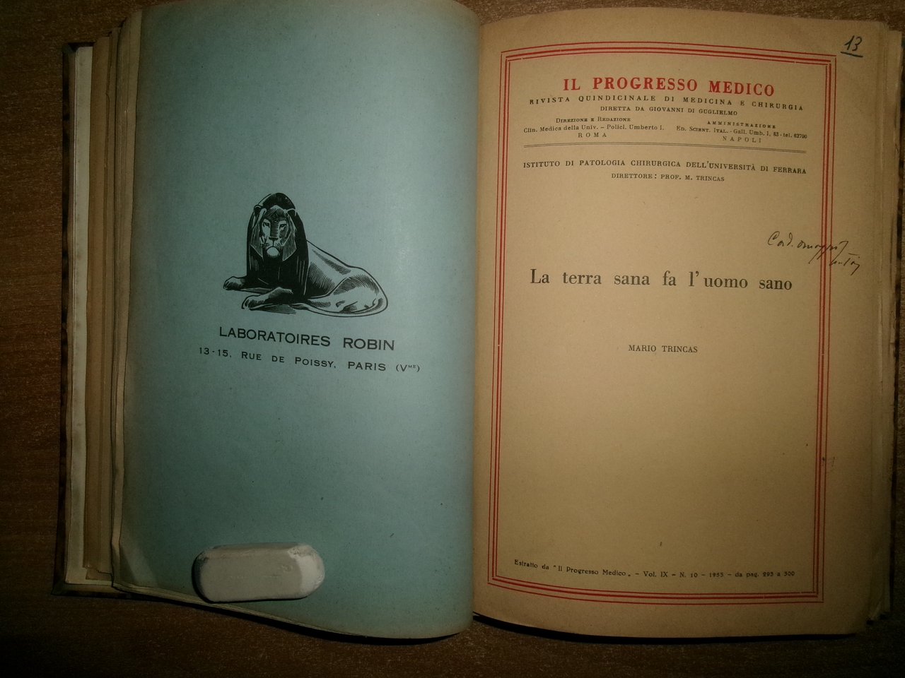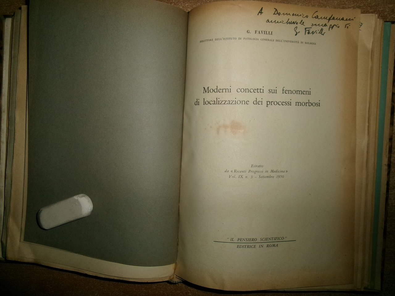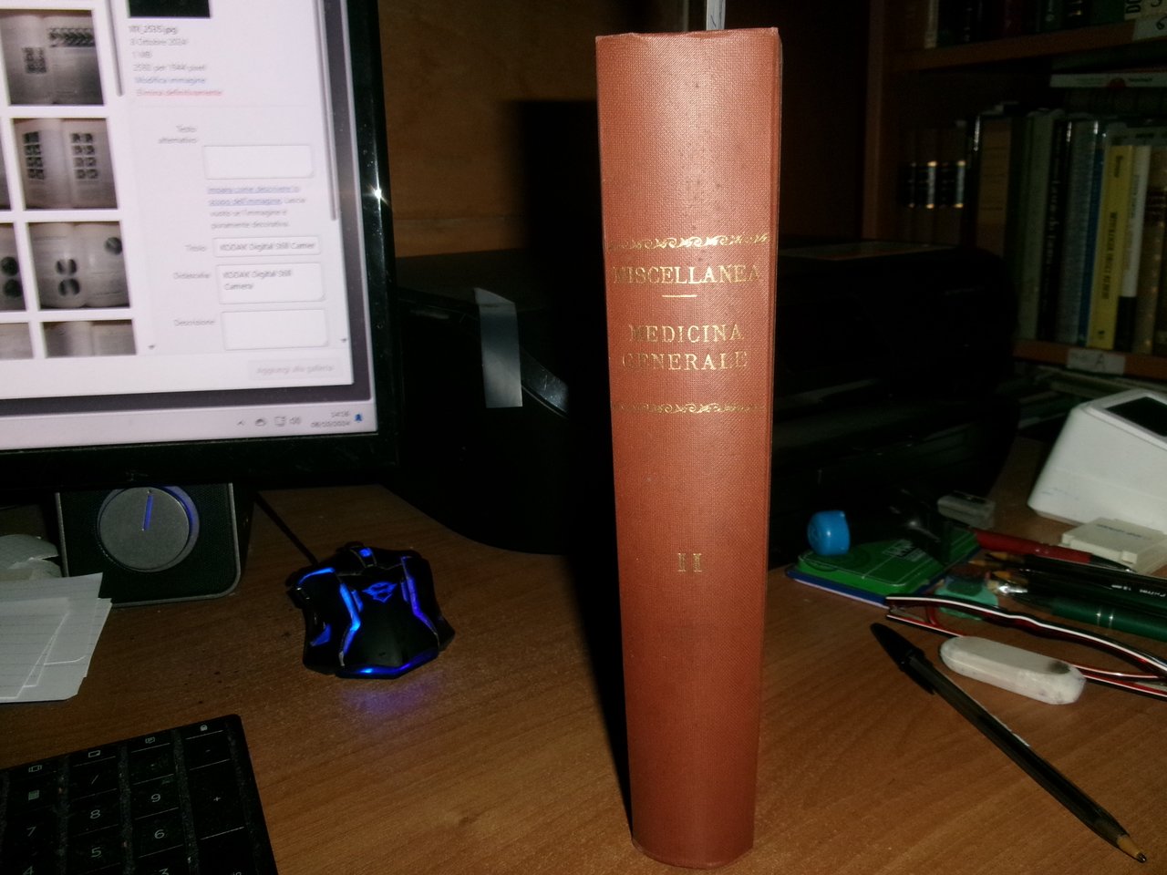 Autori Vari MISCELLANEA di numerosi opuscoli/estratti riguardanti la Medicina Generale con date varie (1953). In-8°, m-tela con titolo in oro al dorso con alcune figure in nero n.t. e indice dattiloscritto all' inizio del libro. Testi la maggior parte in italiano. Sono presenti dediche firmate dagli Autori al Prof. Campanacci. Ben conservato. Uff. salon. sporta 11