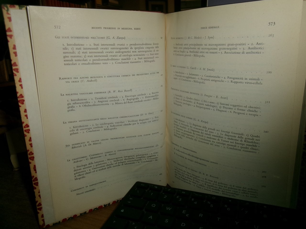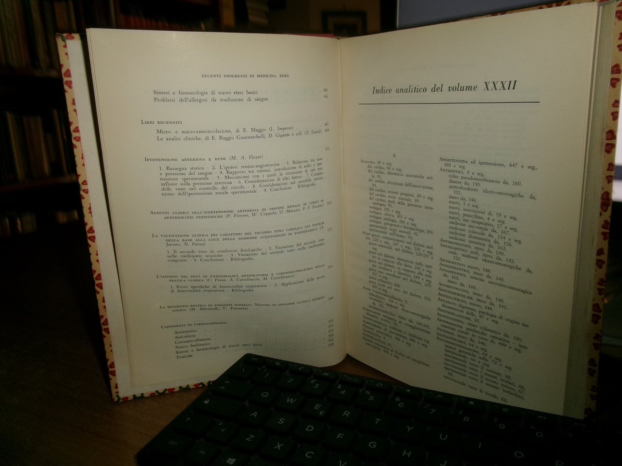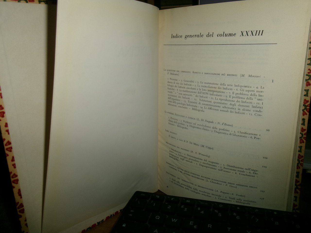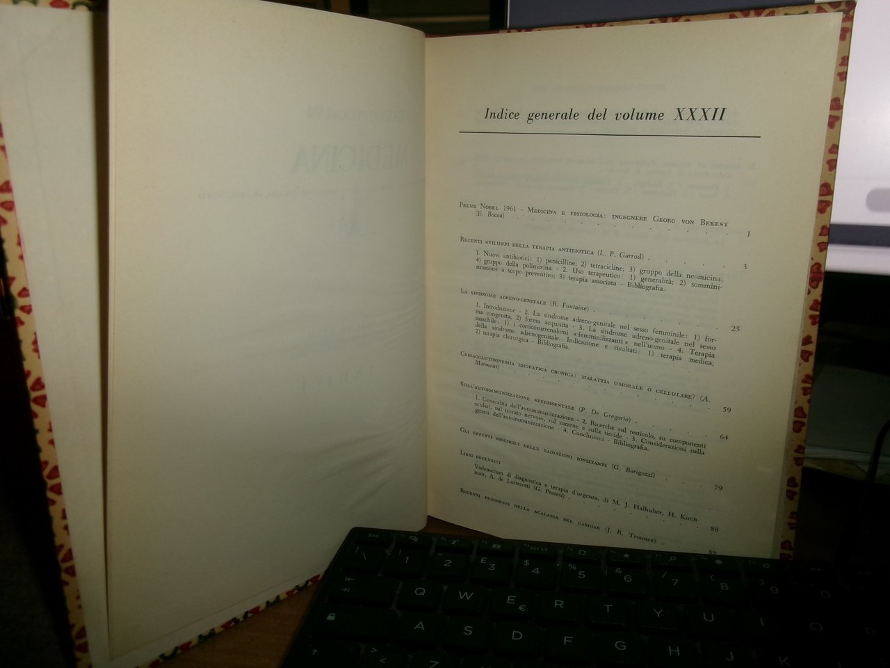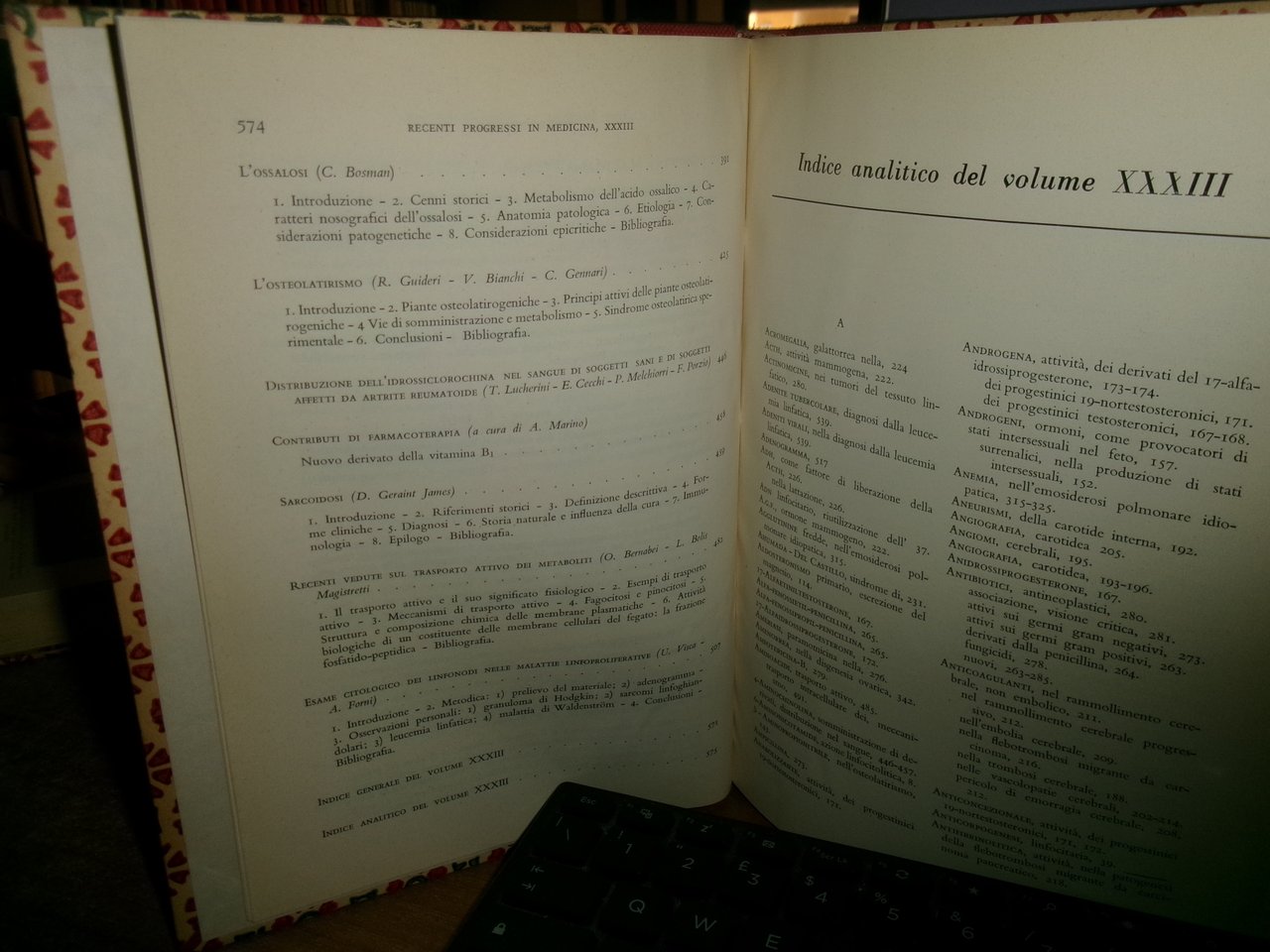 AUTORI VARI. RECENTI PROGRESSI in MEDICINA 1962 - 2 volumi: Vol. XXXII-XXXIII. 2 volumi in-8°, m-tela rossa con titoli in oro entro tasselli ai dorso. (xi), 552 pp.; (xvii), 546 pp. con numerose figure in nero n.t e molte a colori in tavole f.t. Ottimo stato. Uff. salon. sporta 12