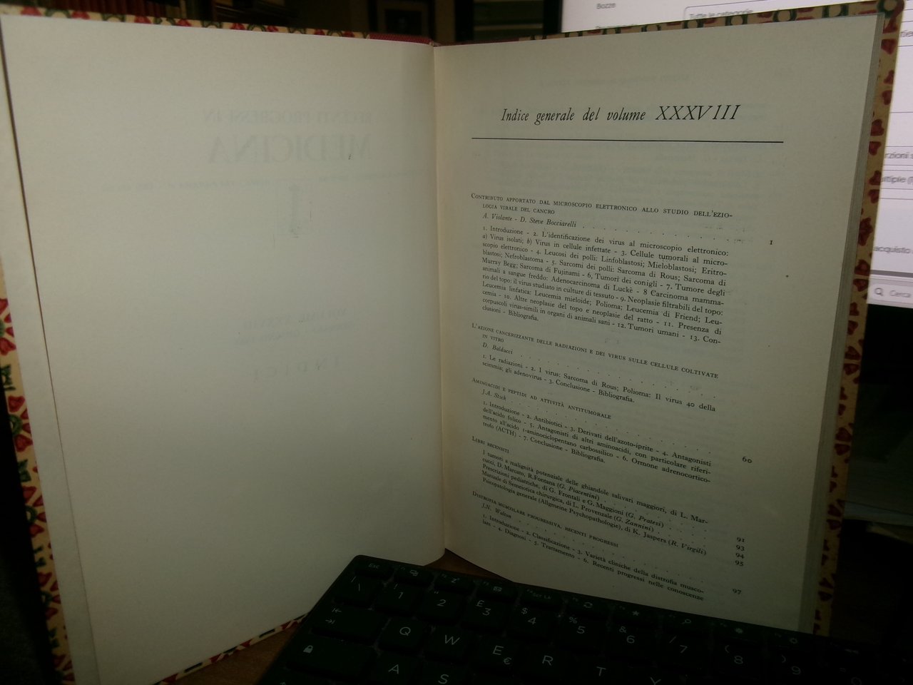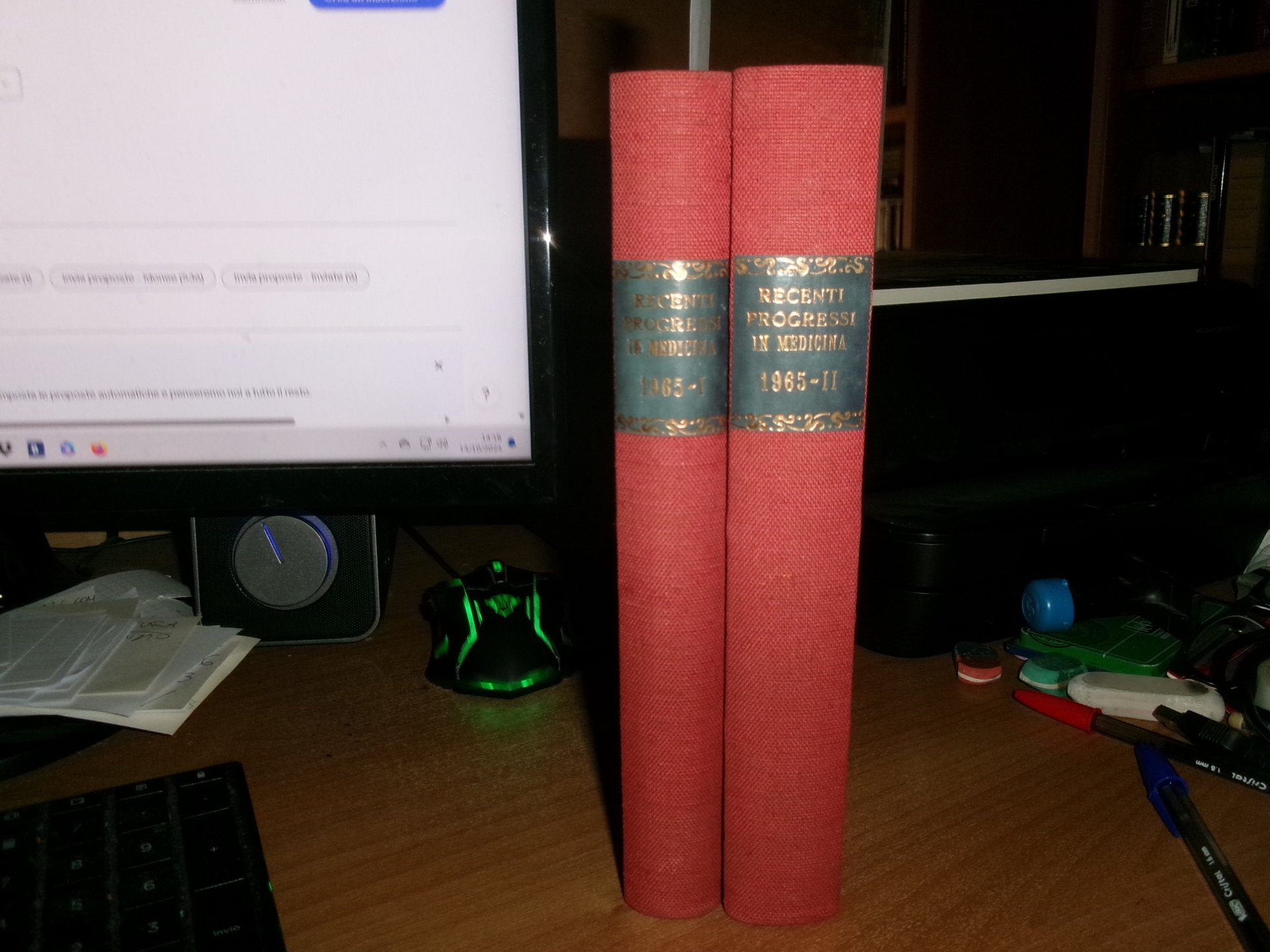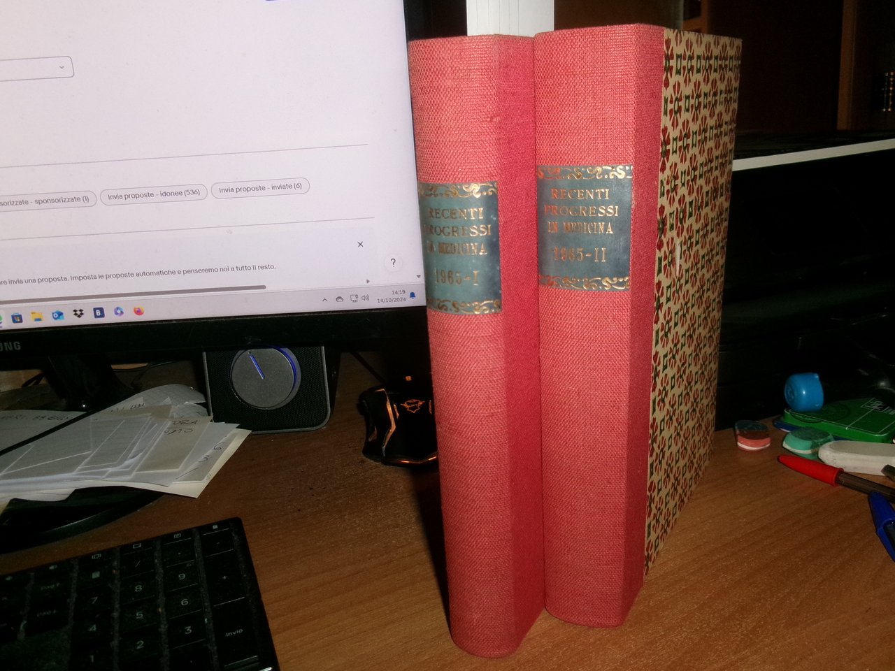 AUTORI VARI. RECENTI PROGRESSI in MEDICINA 1965-2 volumi: Vol. XXXVIII-XXXIX. 2 volumi in-8°, tela rossa con titoli in oro entro tasselli ai dorsi. (x), 550 pp.; (xiii), 652 pp. con alcune figure in nero n.t. Ottimo stato. Uff. salon. sporta 12
