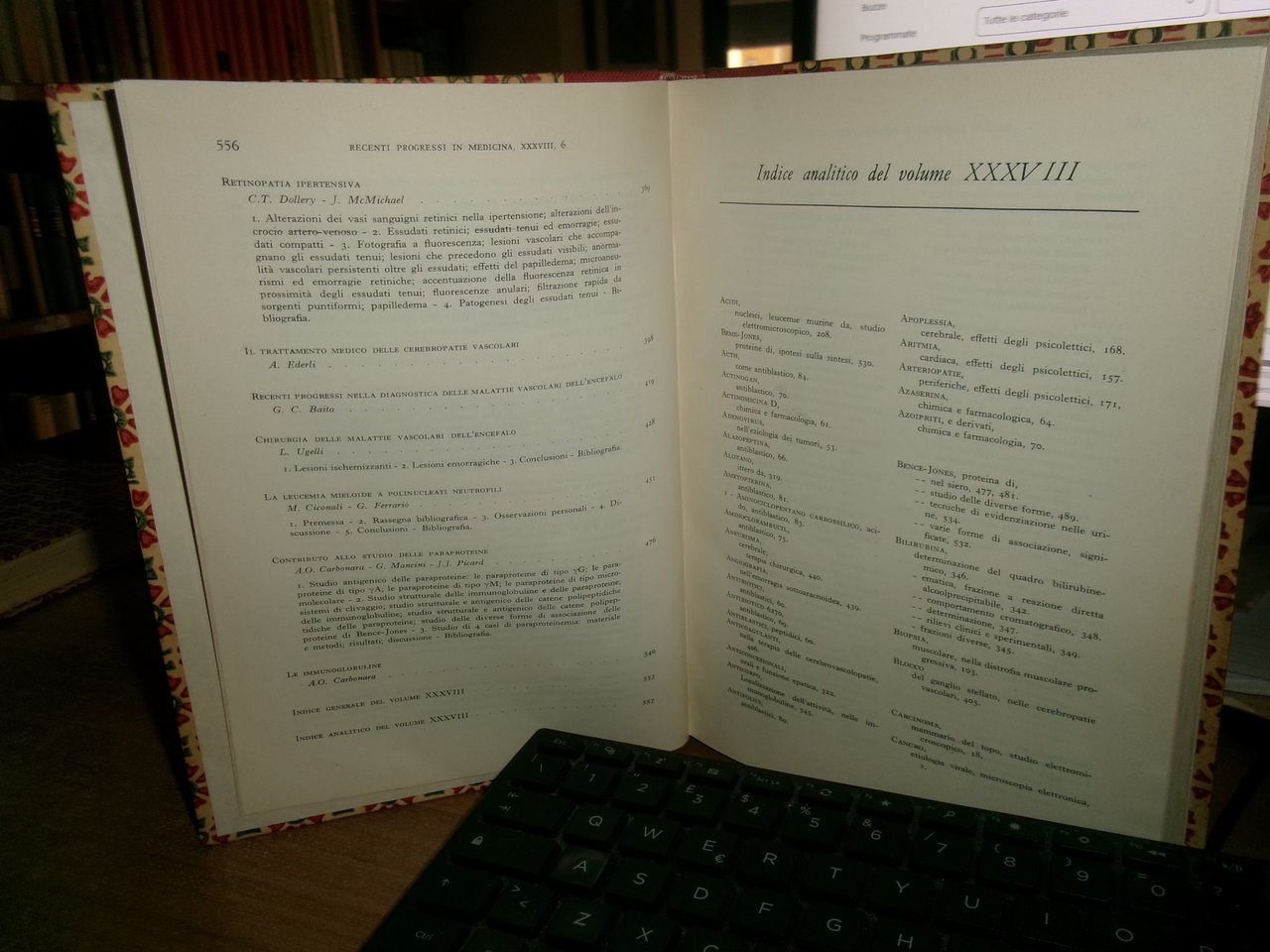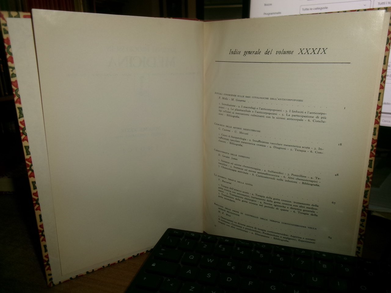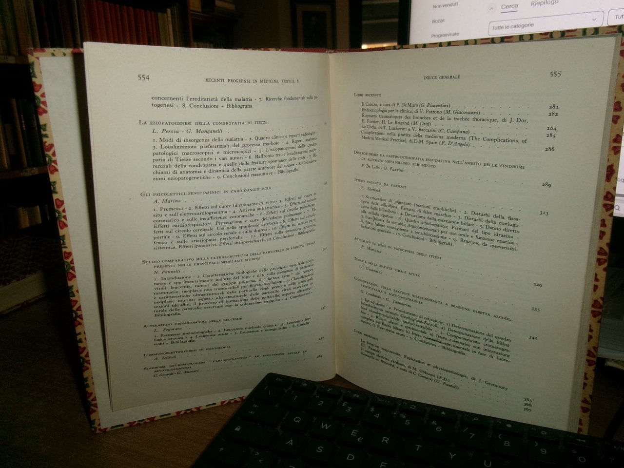 AUTORI VARI. RECENTI PROGRESSI in MEDICINA 1965-2 volumi: Vol. XXXVIII-XXXIX. 2 volumi in-8°, tela rossa con titoli in oro entro tasselli ai dorsi. (x), 550 pp.; (xiii), 652 pp. con alcune figure in nero n.t. Ottimo stato. Uff. salon. sporta 12
