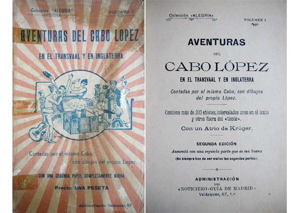 Aventuras del Cabo López en el Transvaal y en Inglaterra. Contadas por el mismo Cabo, con dibujos del propio López. Con un Atrio de Krüger. Segunda edición, aumentá con una segunda parte que mú buena (No siempre han de ser malas las segundas partes).