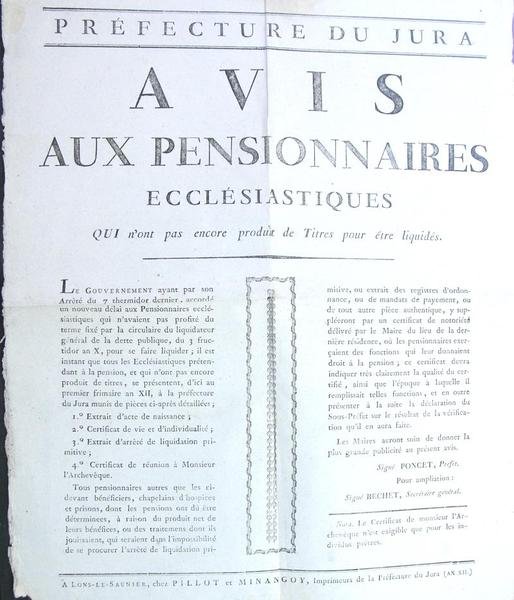 Avis aux pensionnaires ecclésiastiques qui n’ont pas encore produit de Titres pour être liquidés.