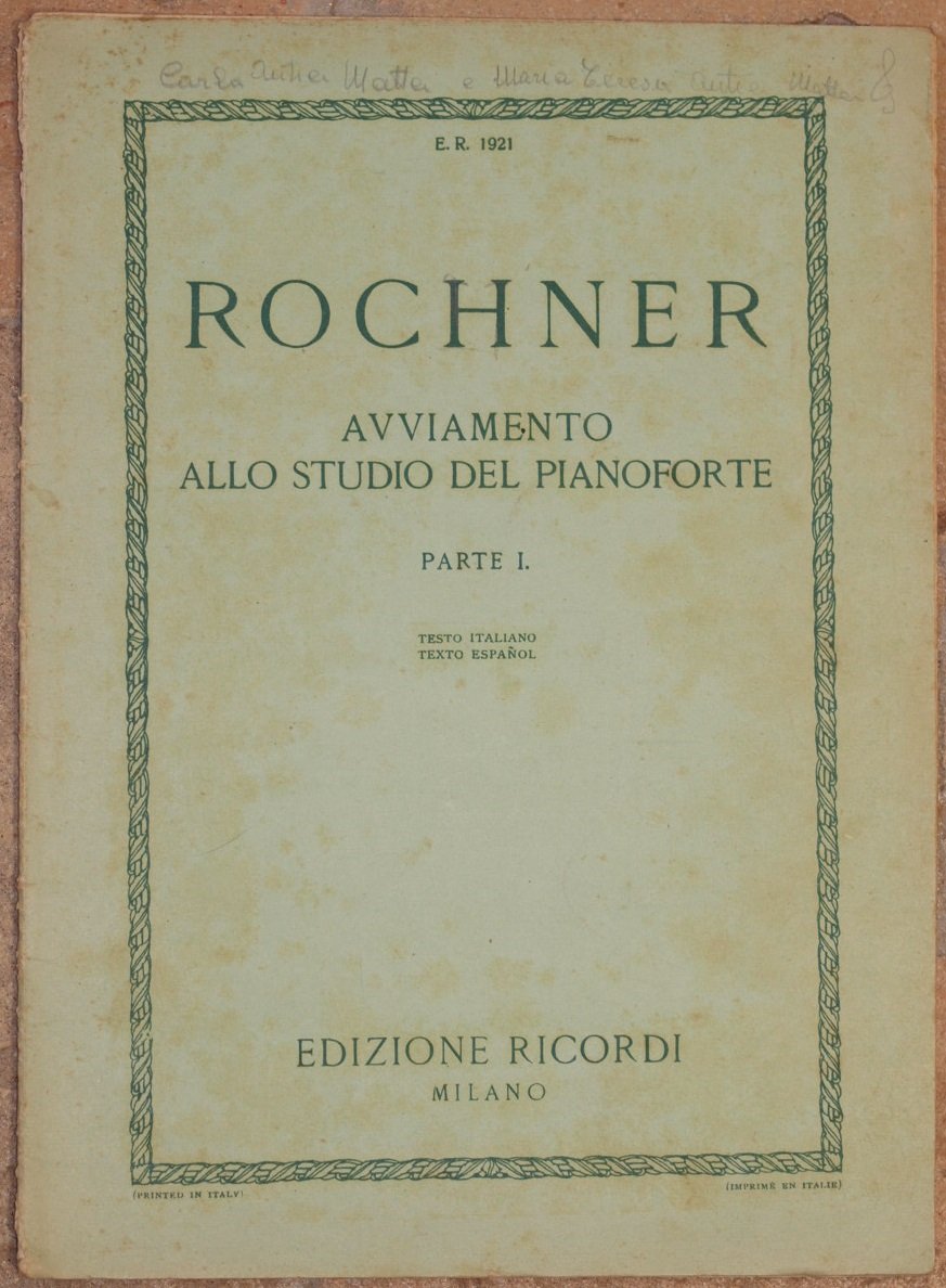 In 4. cm 32x23. Pp. 29. Edizione Ricordi del marzo 1943 di questa raccolta di studi e.r. 1921 parte prima per l'avviamento allo studio del pianoforte di Oscar Rochner. Bella brossura editoriale. Note manoscritte. In buone condizioni e completo. Brossura editoriale in buone condizioni generali con lievi usure ai margini e dorso. Legatura in buone condizioni. All'interno le pagine si presentano in buone condizioni con rare fioriture. Mende. Ricordi edition of march 1943 of this collection of studies e.r. 1921 first part for the beginning to the study of piano by Oscar Rochner. Beautiful editorial cover. Handwritten notes. In good conditions and complete. Editorial cover in good general conditions slightly worn in the edges and spine. Binding in good conditions. Inside pages are in good conditions with occasional foxings. Usage signs.