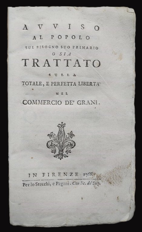 AVVISO AL POPOLO sul bisogno suo primario o sia Trattato sulla totale, e perfetta libertà nel commercio de' grani. Firenze, per lo Stecchi e Pagani, 1768. Segue: AVVISO AL POPOLO sul bisogno suo primario o sia Trattato sulla macinatura de' grani e sul commercio delle farine.