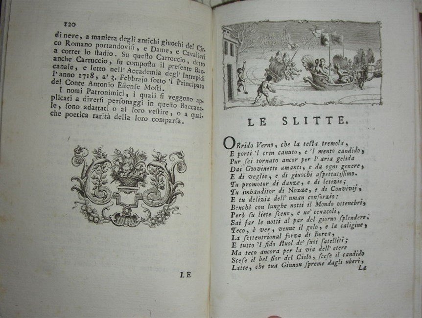 3 voll. in-8, pp. XVI, 272; (6), 291; (8), 289, belliss. leg. m. pelle coeva con ricchi fregi e tit. oro al d., piatti in carta dec. Antip. al primo vol. con la medaglia del Baruffaldi inc. in rame da A. Bulzoni ferrarese su dis. di Stefano Figatelli. Gr. vignetta in rame ai frontespizi. Opera impreziosita da 560 gr. testat. e final. in rame (particolarmente bella l’incisione di chiara ispirazione veneziana, raff. piazza S. Marco in Venezia - vol. II, pag. 191). Splendido esempl. a fogli chiusi in carta forte. Westbury p. 21.Gamba 2143. Canterzani p. 196.