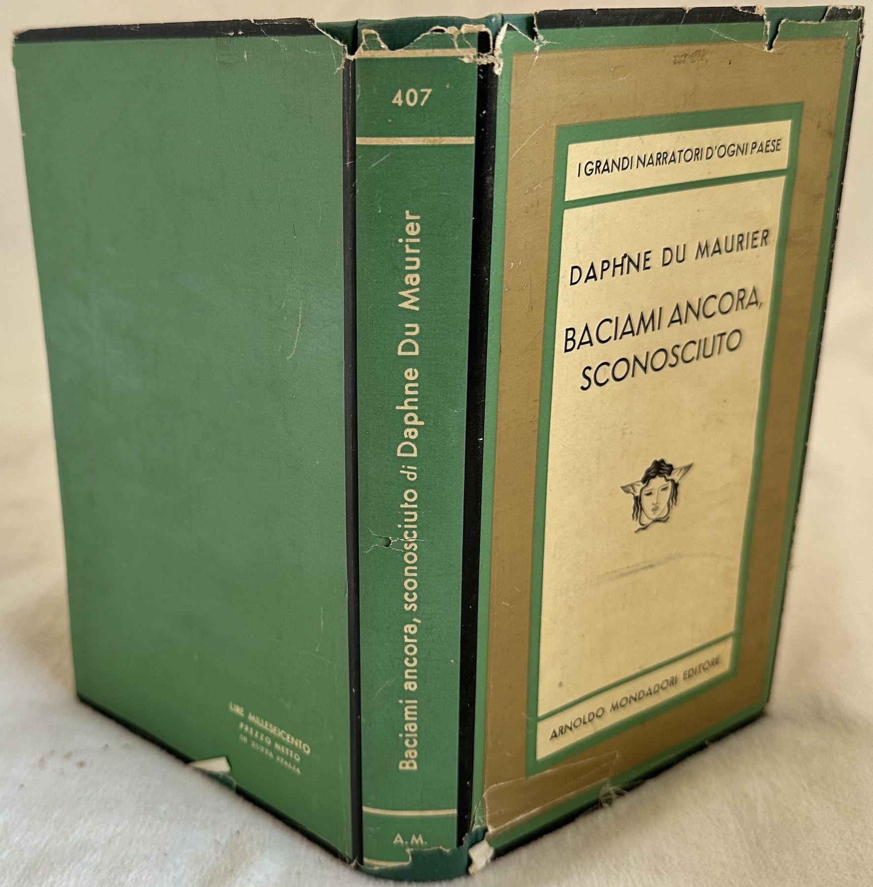 Prima edizione italiana del maggio 1958 del romanzo "Baciami ancora, sconosciuto" (Titolo originale "Kiss me again, stranger") della scrittrice inglese Daphne du Maurier (1907-1958). Volume numero 407 della collana "Medusa". In buone condizioni. Copertina editoriale con sovraccoperta in buone condizioni generali con lievi usure ai margini e dorso. Sovraccoperta con usure e mancanze. Legatura in buone condizioni. Pagine in ottime condizioni con rare fioriture. In 8. cm 19,5x12. Pp. 422+(8).First italian edition of may 1958 of the novel "Baciami ancora, sconosciuto" (Original title "Kiss me again, stranger") by the english writer Daphne du Maurier (1907-1958). Volume number 407 of the series "Medusa". In good conditions Editorial cover with dustjacket in good conditions lighttle worn in the extremities. Dustjacket with wearings and lackings. Binding in good condition. Pages in very good conditions with occasional foxing. In 8. cm 19,5x12. Pp. 422+(8).