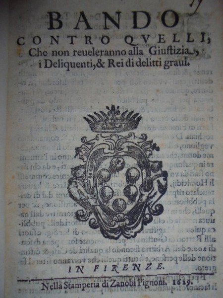 (Bandi - Firenze Giustizia) BANDO contro quelli che non reveleranno alla Giustizia i delinquenti, & rei di delitti gravi