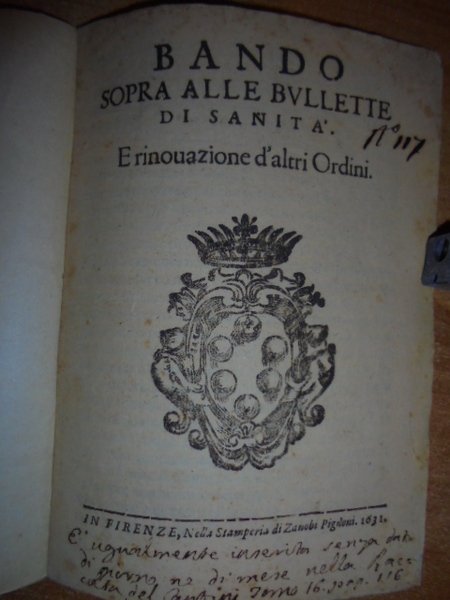 Bandi.BANDO sopra alle bullette di sanità. E rinnovazione d' altri ordini. In Firenze, nella Stamperia di Zanobi Pignoni, 1631. In-4° antico, cop. in cartoncino recente. (8) pp. Arme ducale nel front. Postilla a penna di antica mano nel margine inferiore del front. (Riguarda la prevenzione di eventuali epidemie). Opuscolo. Pac. 3. Uff. Mob 3