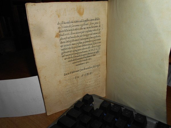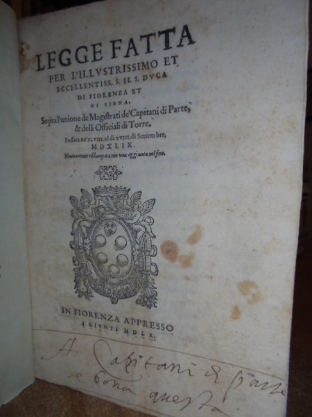 TOSCANA (Ducato). Legge fatta per l' Illustrissimo et Eccellentiss. S. Il S. Duca di Fiorenza et di Siena. Sopra l' unione de Magistrati de' Capitani di Parte, & delli Officiali di Torre. Passata ne' XLVIII. el di XVIII. di Sttembre MDXLIX. Nuovamente ristampata con una aggiunta nel fine. In Fiorenza Appresso Giunti, 1560. In-8°, br. 52 pp. Stemma ducale nel front. Alcune sottolineature e qualche nota nel margine di antica mano in due o tre pp. VENDIBILE SOLO IN ITALIA; Neg. mob. 6