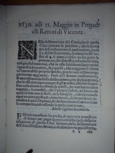 Bandi. PARTE presa nel Consiglio della Città di Vicenza, et confermata nell' Eccellentissimo Senato per distributione della spesa del nuovo recinto della medesima Città. In Vicenza, per Francesco Grossi (1630). In-4° antico, cop. cartoncino. (6) pp., 1 f. bianco. Leone di S. Marco inciso in legno nel front. Opuscolo. Pac. 3. Uff. mob. 3