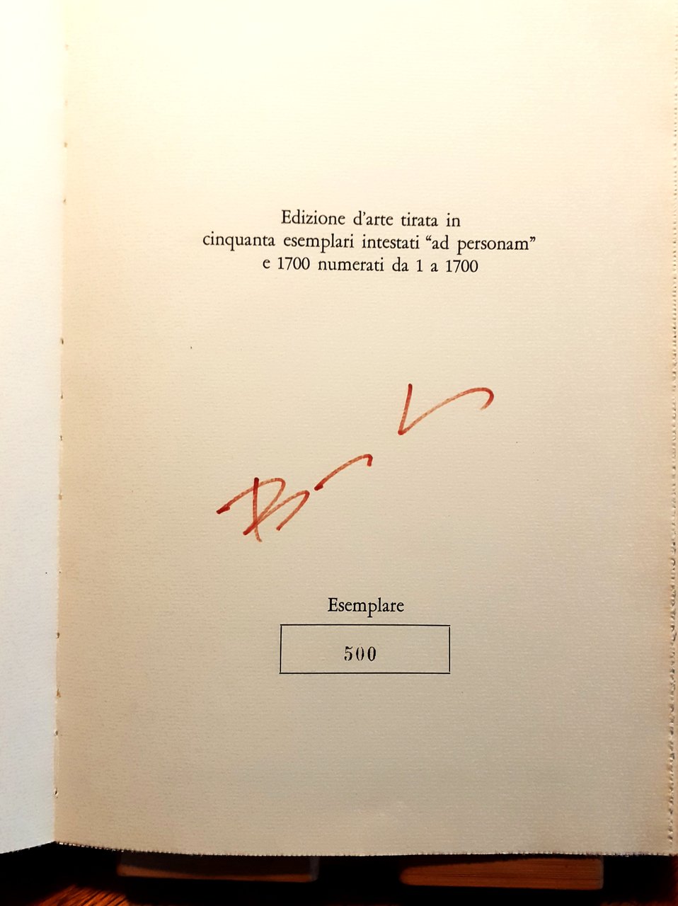Edizione d'arte tirata in cinquanta esemplari intestati ad personam" e 1700 numerati da 1 a 1700. Esemplare n. 500 con firma dell'Autore a pennarello rosso. Stampato dalle Arti Grafiche Perfecta - Milano. La carta è stata fabbricata a mano appositamente dalle Cartiere Ventura con filigrana e marchio. In-4, pp. nn. (ca. 56), rilegatura in cartone telato con juta grezza e titolo in rosso al piatto. Con serigrafie a due tre colori (b/n - b/n/rosso-magenta). Stato ottimo (in parte intonso)"