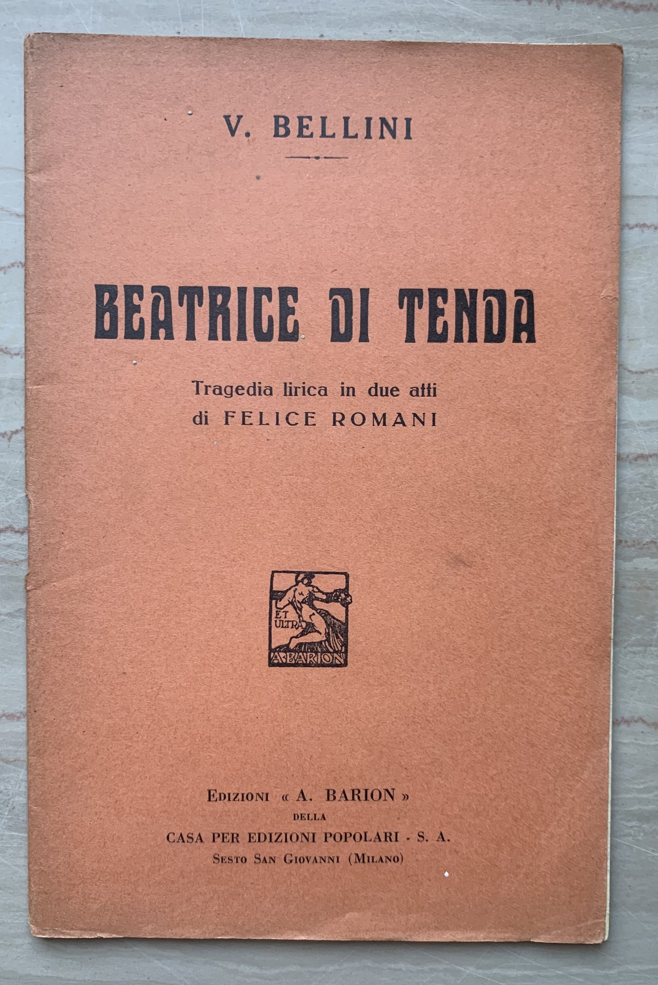 ed. VII-1933 (1a rappresentazione: Venezia, Teatro La Fenice, 16 marzo 1833). XVI/32/brossura in carta leggera albicacca con grafica in nero ai piatti. Stato buono (leggera usura della copertina ai margini e al dorso con, in particolare, un piccolo taglietto al margine destro del primo piatto - copertina e pagine brunite).
