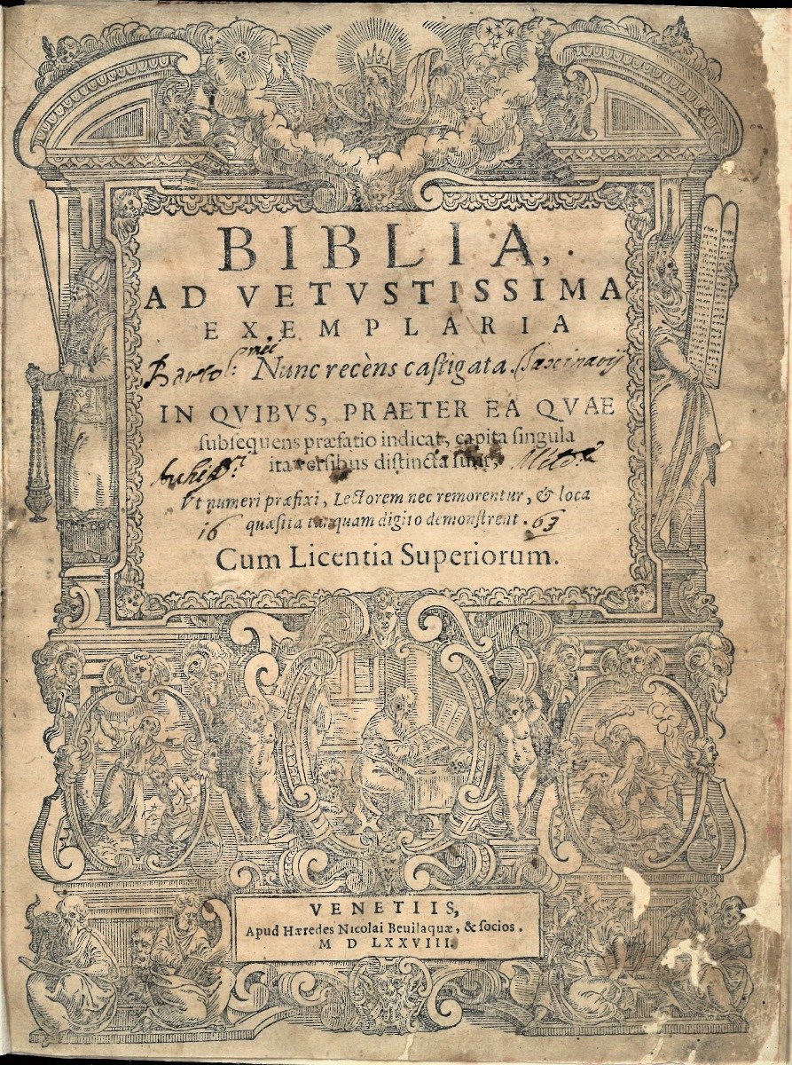 <p>20 cm, rilegatura settecentesca in piena pergamena, titolo ben manoscritto al dorso, tagli spruzzati; Frontespizio e 11 carte (Praefatio, Hieronimi Prologus, Epistola S. Hieronymi, Praefatio in pentateucum Moysi, Index Testimoniorum, Francisci Antonii Faccini Aquilani, Praefatio). p. 1126. Antico Testamento: p. 1-828; Praefatio 829-830; Seguono i Vangeli di Matteo, Marco, Luca e Giovanni, epistole di Paolo, ecc: p. 831- 1050. Hebraicorum Chaldeaeorum Interpretatio p. 1051-1056; Index Rerum et Sententiarum 1057-1126) 350 illustrazioni xilografiche ad 1/3 di pagina e 250 vignette. Frontespizio con fine xilografia di scene bibliche è uniformemente brunito e foderato da una carta bianca al verso. Moltissimi capilettera figurati o decorati.Testo latino su due colonne incorniciato da doppio filetto. Volume rifilato alla sola parte superiore, senza perdita ne di testo ne di cornice. Diverse bruniture che non ostacolano la lettura del testo. Restauro a 2 carte con perdita ci circa 40 righe complessive. Bel esemplare completo</p>